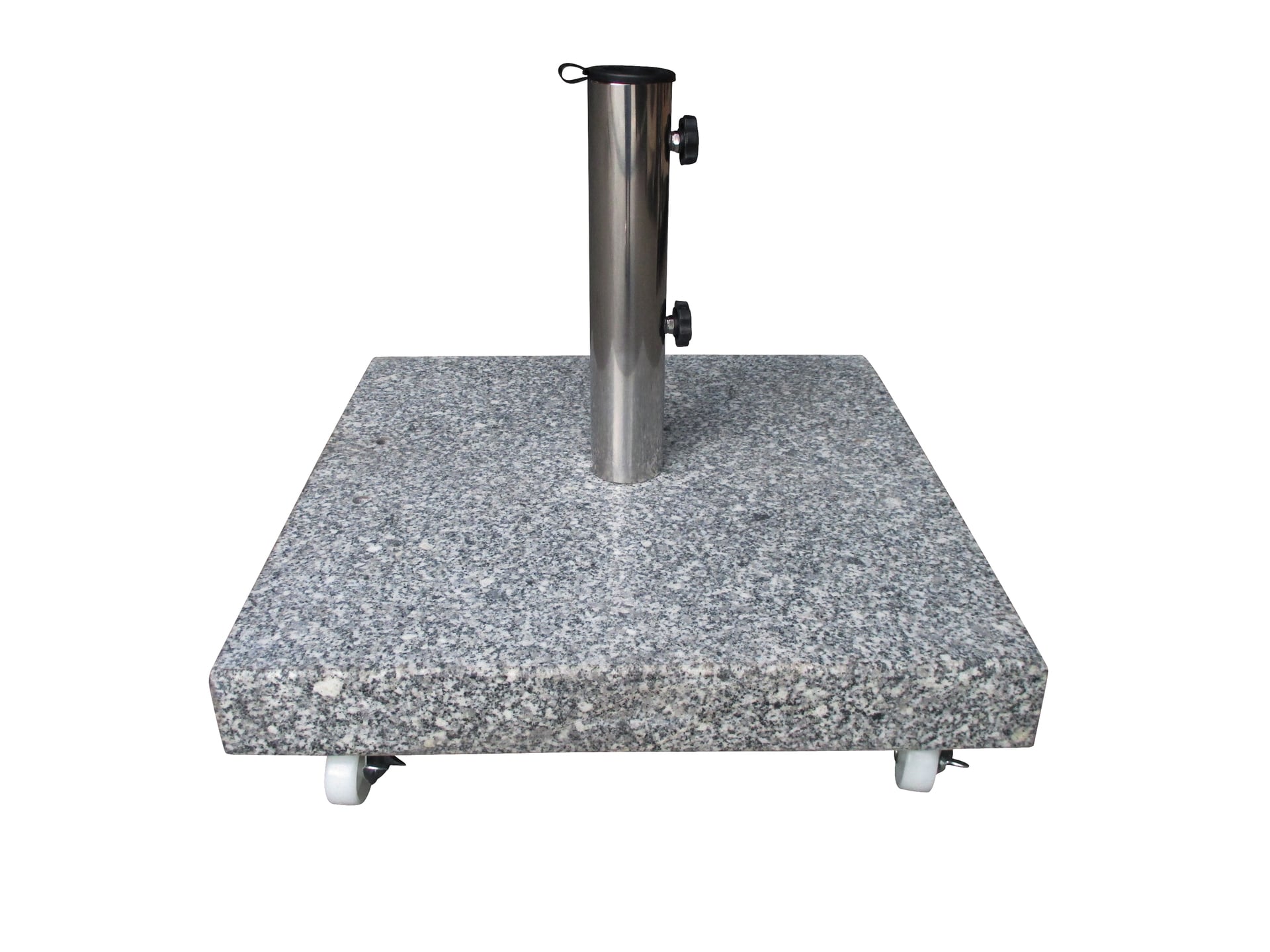 Der formschöne Schirmständer besteht aus echtem Granit und hat eine geschliffene und polierte Oberfläche. Der Sonnenschirmständers ist mit vier Rollen an der Unterseite ausgestattet, sodass er trotz seines hohen Gewichts extrem leicht bewegt werden kann. Die Rollen können außerdem arretiert werden. Das stabile Edelstahlrohr ist geeignet für Schirmstöcke bis 48mm Stärke.