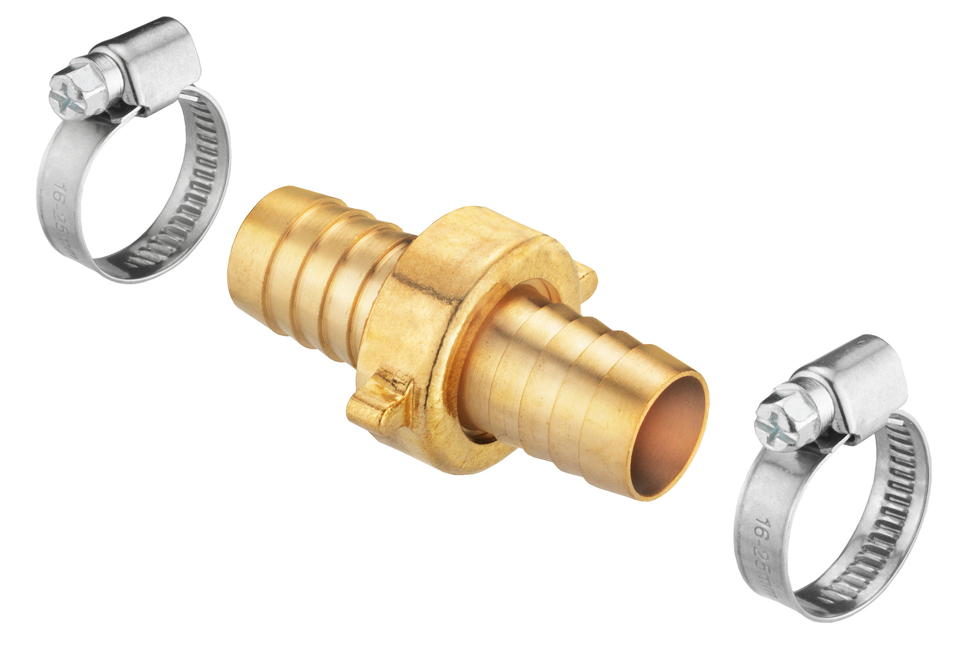 Schlauchverschraubung Messing, Blank, 3-teilig, Flachdichtend, Inkl. 2 Schlauchschellen Ø 16 – 25 mm (3/4″), 1″ IG-AG, Tülle Ø 20,5 mm