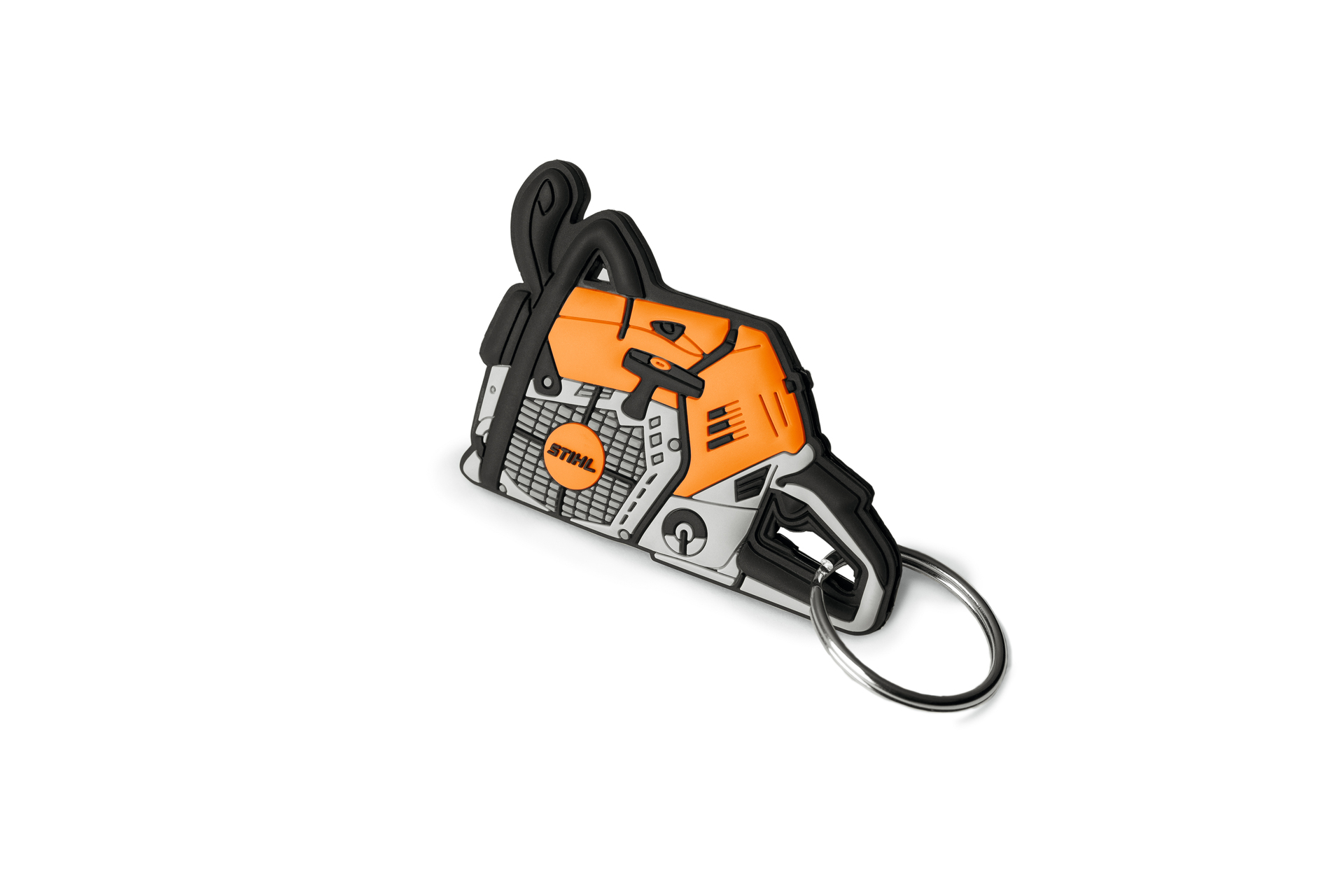 STIHL-Schlüsselüberzug in Motorsägenform in typischen STIHL-Farben, ca. 1 cm dick, aus PVC.