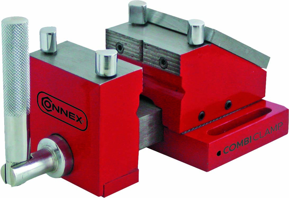 Der Schraubstock COMBICLAMP von CONNEX ist aus hochwertigem Sphärostahlguss (hohe Zugfestigkeit und Schlagzähigkeit) gefertigt. Er hat gehärtete Stahlbacken und integrierte Rohrspannbacken. Die Führung ist nachstellbar. Die vier Spannhörner sind gegen die mobile Amboss-Stahlplatte auswechselbar. Der Knebel ist umklappbar, sodass die Spindel auch in eine waagerechte Position verstellt werden kann, durch die drehbaren und auswechselbaren Spannhörner können die unterschiedlichsten Werkstücke optimaleingespannt werden: eckig, asymmetrisch, rund, zylindrisch.