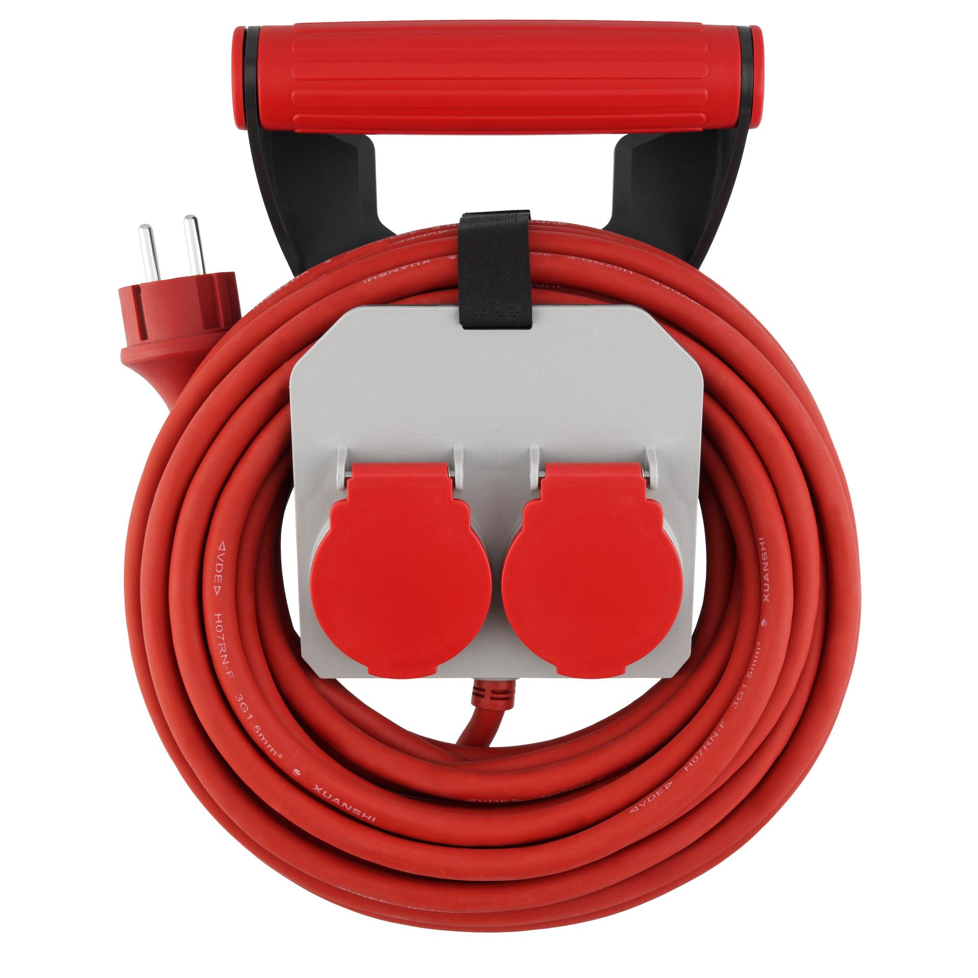 Kabel-Wandhalterung mit Tragegriff die auch mobil verwendbar ist. 2 x Schutzkontaktsteckdosen können mit max. 3680W belastet werden. Dank IP 44 ist die Verlängerung spritzwassergeschützt und für den zeitweiligen Einsatz im außenbereich geiegnet. Die Kabelfixierung durch Klettband macht ein einfaches und schnelles aufwickeln der Zuleitung möglich. Die Länge der Zuleitung beträgt 10 m. inkl. Montagezubehör