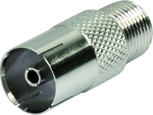 Der silberne F-Adapter hat 1 x F-Kupplung auf 1 x Koaxial (IEC)-Buchse. Er dient zum Verbinden von F-Steckern mit Kabeln mit Koaxial (IEC)-Stecker. Der Adapter besteht aus vernickeltem Metall. Die Größe beträgt ca. 25 mm.