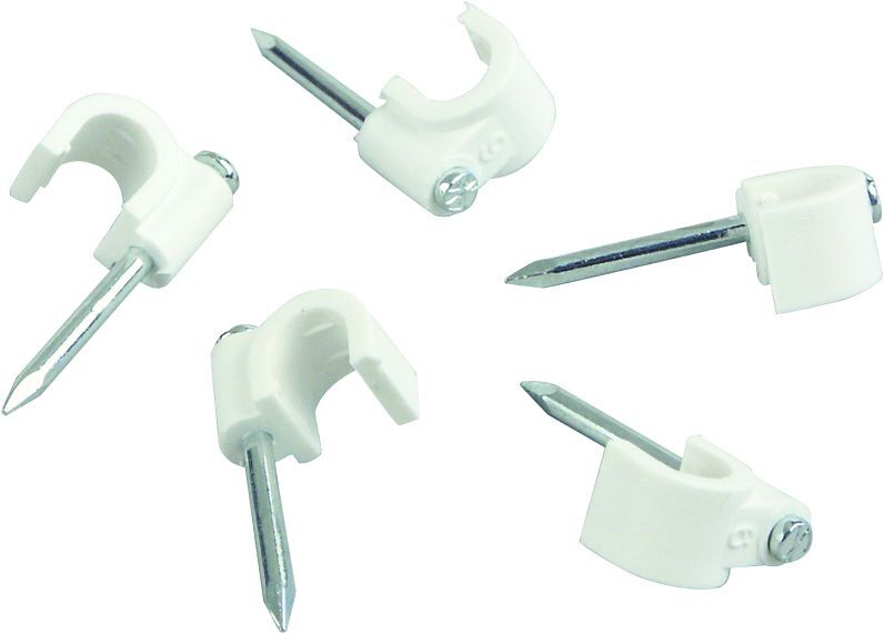 Die Nagelschellen dienen zur problemlosen Kabelfixierung in Kabelschlitzen, Verlegetrassen und an Wänden. Sie sorgen für eine schnelle und sichere Befestigung von Koaxkabeln mit bis zu 7 mm Durchmesser. Die Nagelschellen bestehen aus schlagfestem Kunststoff und haben eine eingedrückte Stahlnadel, die 25 mm lang ist und einen 2 mm Durchmesser hat.