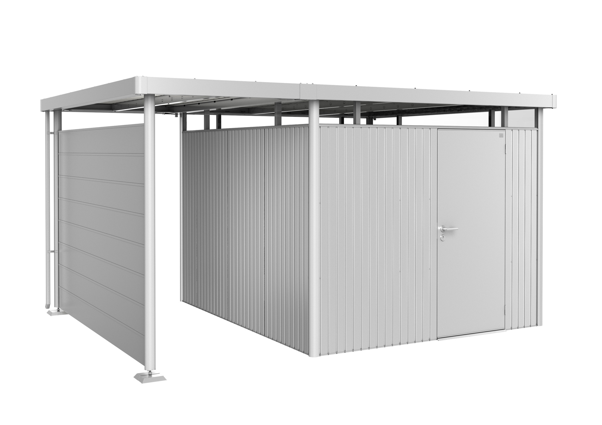 Das Seitendach wird am Gerätehaus HighLine® (ab Gr. H2) jeweils an der Seite mit der Regenrinne – wahlweise ein- oder beidseitig – fixiert. Die Breite des Seitendaches Gr. S beträgt 150 cm und bei Gr. L 282 cm. Die Alu-Stützen sind mit höhenverstellbaren Füßen ausgestattet. Das Regenfallrohr ist inkludiert.