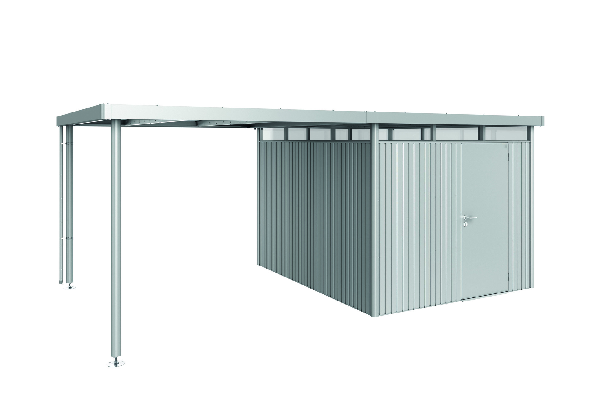 Das Seitendach wird am Gerätehaus HighLine® (ab Gr. H2) jeweils an der Seite mit der Regenrinne – wahlweise ein- oder beidseitig – fixiert. So entsteht eine überdachte Freifläche im Ausmaß der einfachen/doppelten Grundfläche des Gerätehauses. Die Alu-Stützen sind mit höhenverstellbaren Füßen ausgestattet. Regenfallrohr inkl. Die Dachfläche des Seitendaches ist immer quarzgrau-metallic!