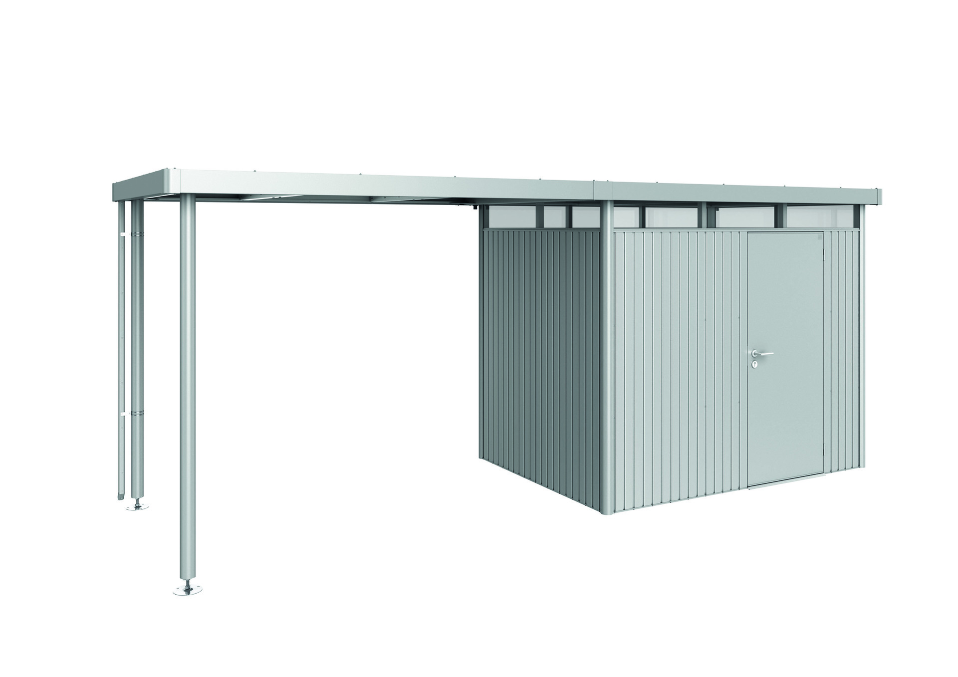 Das Seitendach wird am Gerätehaus HighLine® (ab Gr. H2) jeweils an der Seite mit der Regenrinne – wahlweise ein- oder beidseitig – fixiert. So entsteht eine überdachte Freifläche im Ausmaß der einfachen/doppelten Grundfläche des Gerätehauses. Die Alu-Stützen sind mit höhenverstellbaren Füßen ausgestattet. Regenfallrohr inkl. Die Dachfläche des Seitendaches ist immer quarzgrau-metallic!