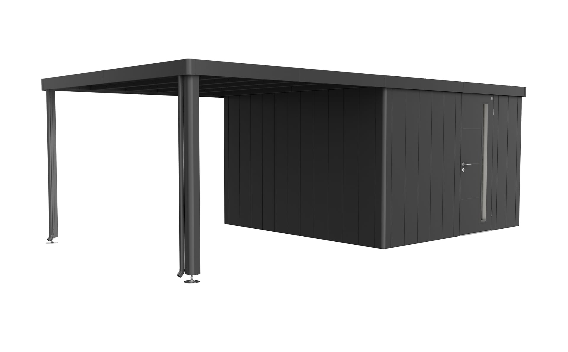Das Seitendach wird am Gerätehaus Neo (ab Gr. 2A) wahlweise ein- oder beidseitig – fixiert. Die Breite des Seitendaches liegt bei 3 m. Die Alu-Stützen sind mit höhenverstellbaren Füßen ausgestattet. Zwei Regenfallrohre sind inkludiert.