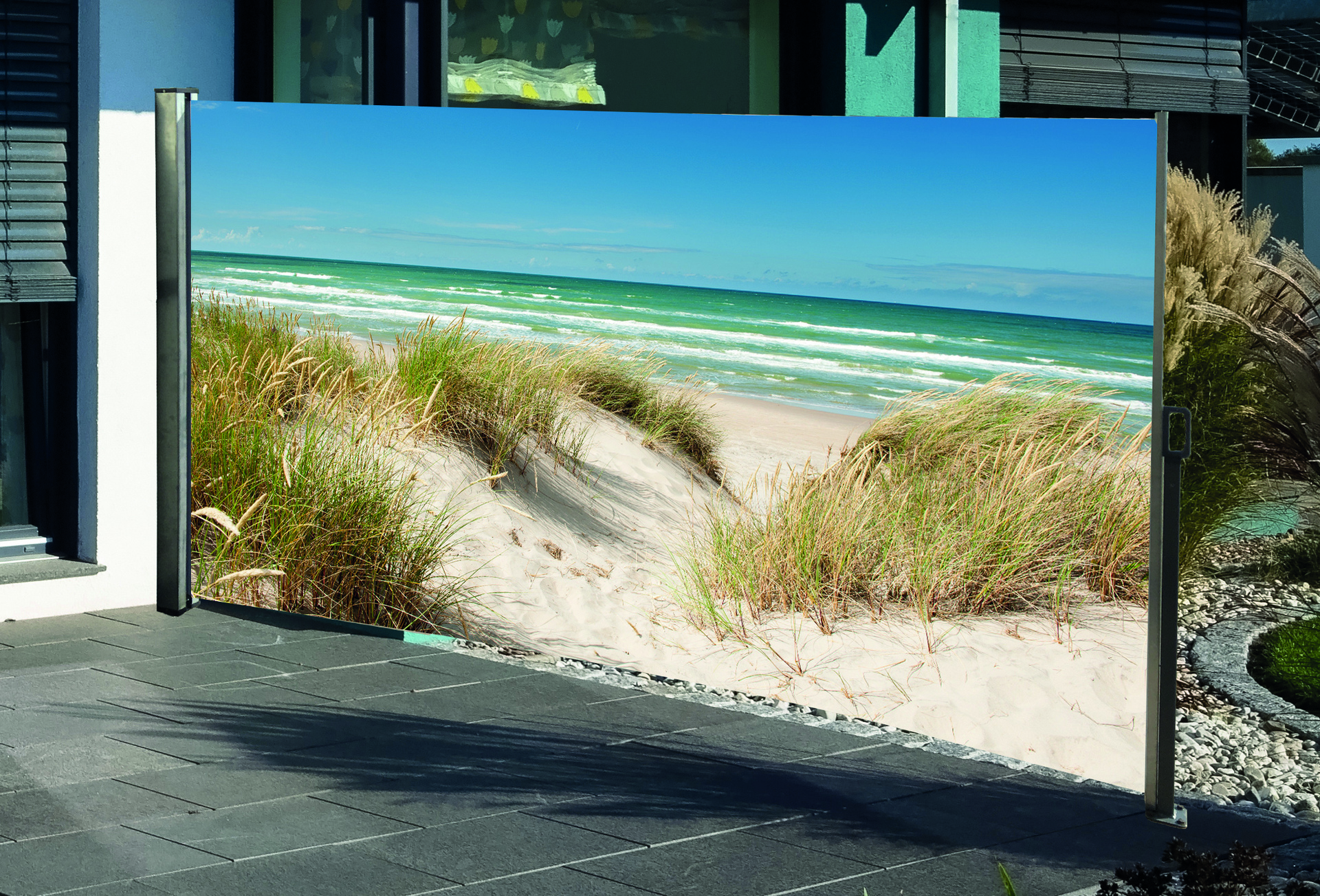 Seitenmarkise mit Fotodruck für Urlaubsfeeling bei Dir zu Hause und schützt dich zudem vor Wind und neugierigen Blicken.
