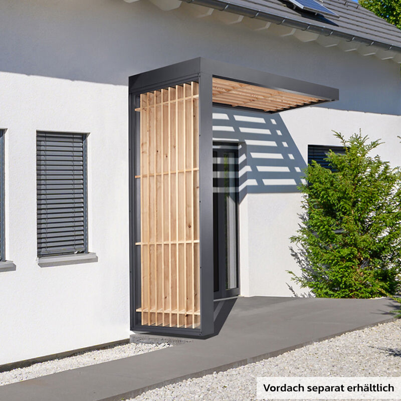 Mit dem Seitenteil Holzminden verleihst du deinem Hauseingang einen unverwechselbaren Charakter im klassischen Bauhaus-Stil. Die einmalige Verschmelzung von robustem Aluminium, heimischer Schwarzwälder Tanne und edlem Glas sorgt für ein stilvolles Entree, das Funktionalität und Design auf höchstem Niveau vereint. Das Seitenteil bietet dir einen massiven Schutz vor Wind und Wetter und wertet deine Fassade durch seine hochwertige Präsenz sofort auf. Der Rahmen besteht aus langlebigem Aluminium mit einer kratzfesten Pulverbeschichtung in Anthrazit, die extrem unempfindlich gegen UV-Strahlung und Nässe ist. Die Füllung aus Schwarzwälder Tanne schafft eine warme, natürliche Atmosphäre und lässt sich bei Bedarf individuell ölen oder lackieren, um sie perfekt an deinen Stil anzupassen. Kombiniert wird das Holz mit einer 4 mm starken Echtglasscheibe (ESG), die für Transparenz und Leichtigkeit sorgt. Ein besonderes Highlight ist das integrierte, nicht sichtbare Rohr-Entwässerungssystem, das Regenwasser diskret ableitet. Das Seitenteil lässt sich flexibel an beiden Seiten des passenden Rechteckvordachs Holzminden montieren. Das passende Montagematerial für festes Mauerwerk liefern wir dir direkt mit, damit du deine Seitenblende schnell und unkompliziert anbringen kannst. Aktualisiert: Februar 2026 Technische Daten Maße: 220 cm x 90 cm x 12,5 xcm Abdeckung: schwarzwälder Tanne Material Rahmen: pulverbeschichtetes Aluminium Farbe: Anthrazit matt Passend für: Rechteckvordach Holzminden Irrtümer oder Änderungen vorbehalten.
