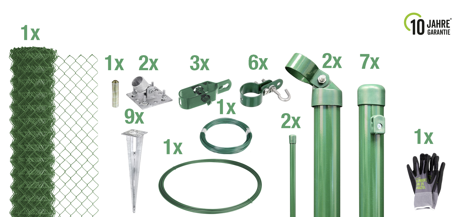 1x Maschendraht-Geflecht – 7x Zaunpfosten – 2x Streben – 3x Drahtspanner – 1x Spanndraht – 1x Bindedraht – 2x Geflechtspannstab – 6x Schellen – 9x Bodenhülse – 2x Strebenplatte – 1x Einschlag-Werkzeug