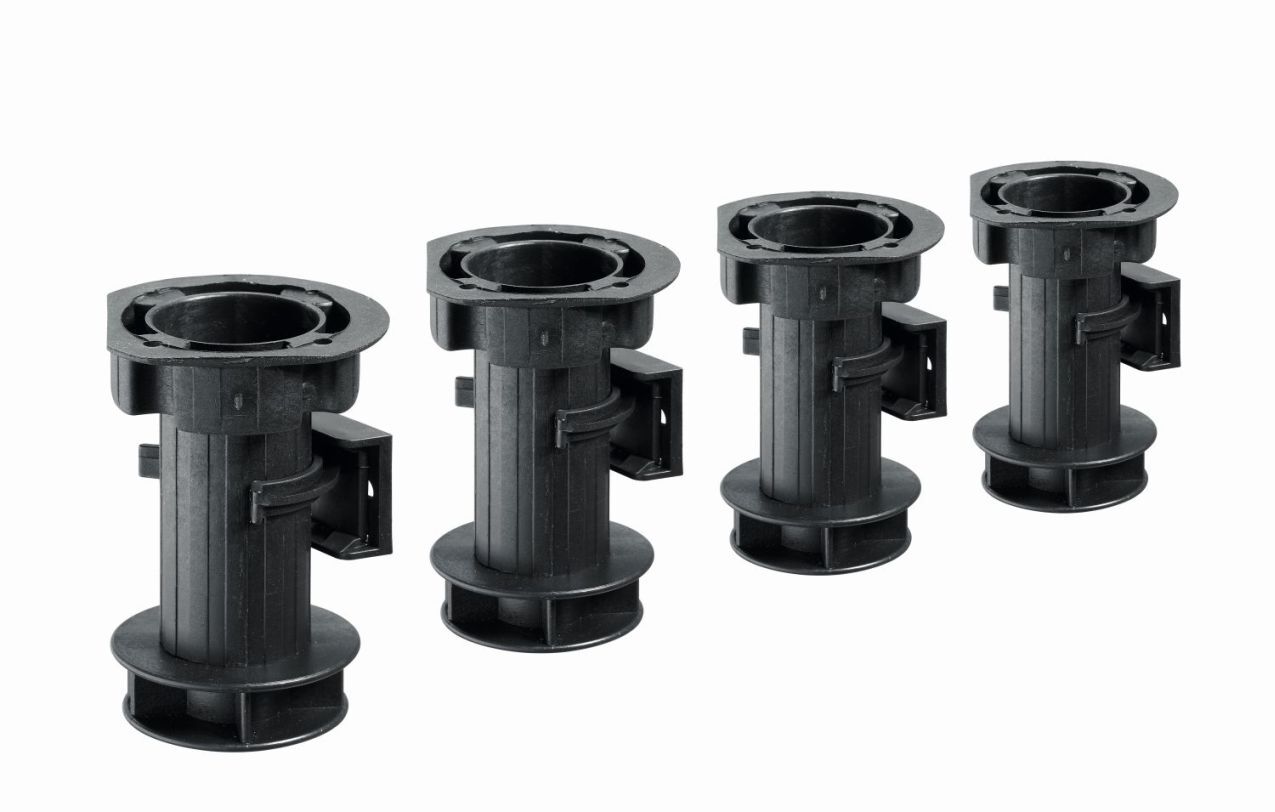 Set mit vier Kunststoff-Sockelverstellfüßen für Küchenunterschränke. Maximale Belastung von 200 kg und höhenverstellbar von 100 – 120 mm. Inkl. Klips zur Befestigung von Frontblenden.