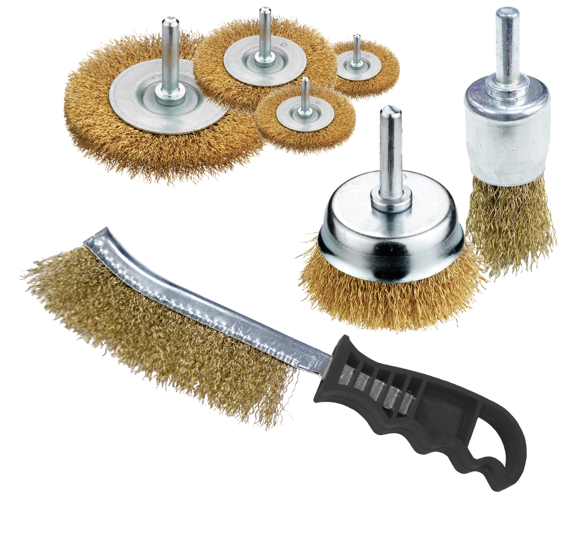 Bestehend aus 7 verschiedenen Bürsten, ideal geeignet zum Schruppen, Bürsten, Reinigen, Entrosten uvm., Material: Stahldraht mit Messingbeschichtung, max. Drehzahl: 4.500 U/min, Schaftaufnahme Ø 6 mm x 28mm, Set bestehend aus nachfolgenden Formen und Abmessungen: