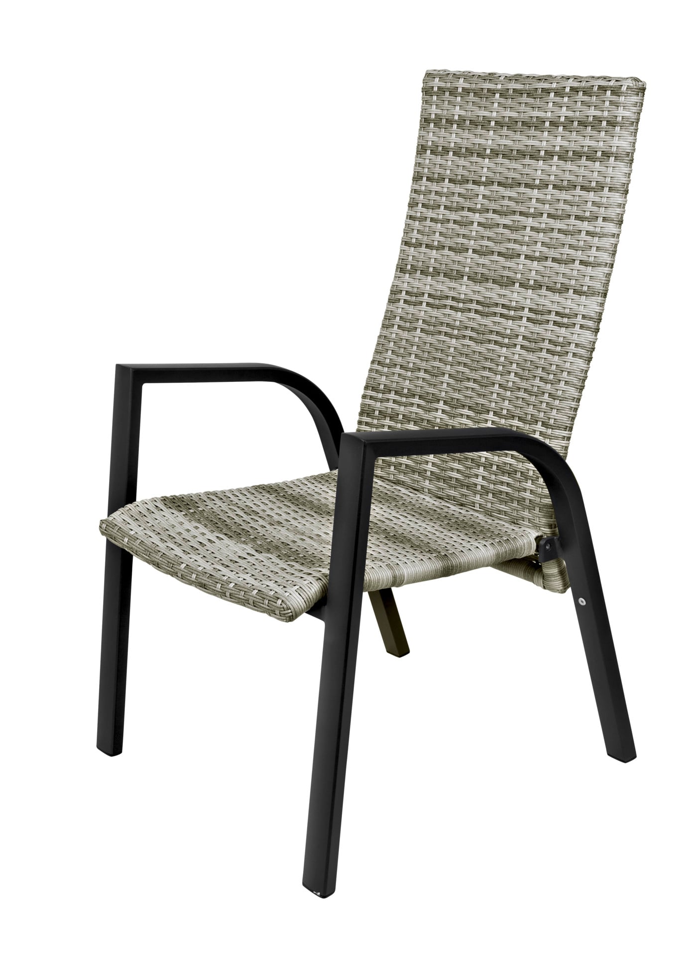 Bequem sitzen. Aluminium-Gestell, matt anthrazit, Kunststoffgeflecht silbergrau, stufenlos verstellbare Rückenlehne, stapelbar. Ca. B 59 x H 110 x T 69 cm.