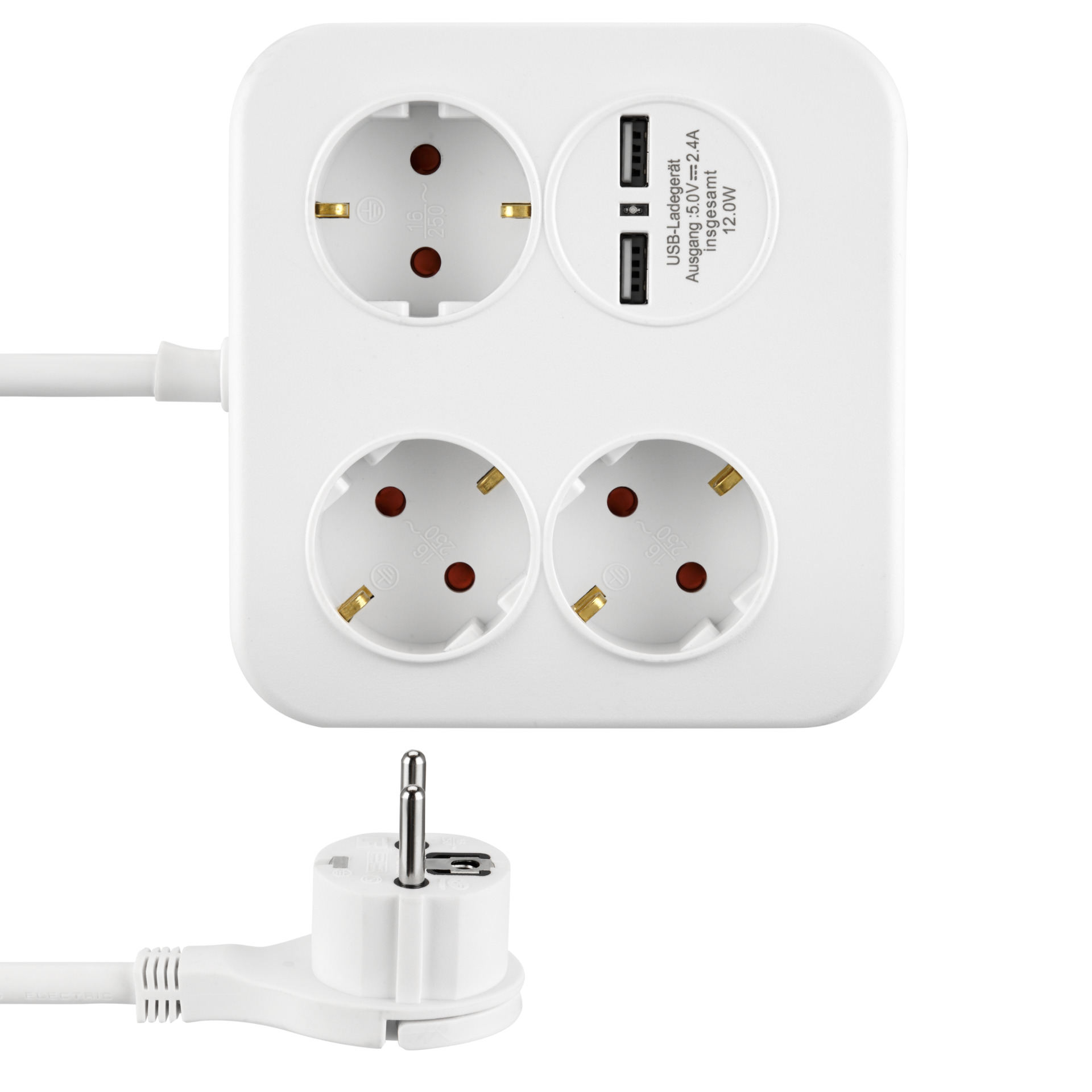 Mit 3 Schutzkontaktsteckdosen und 2 USB-Anschlüssen
