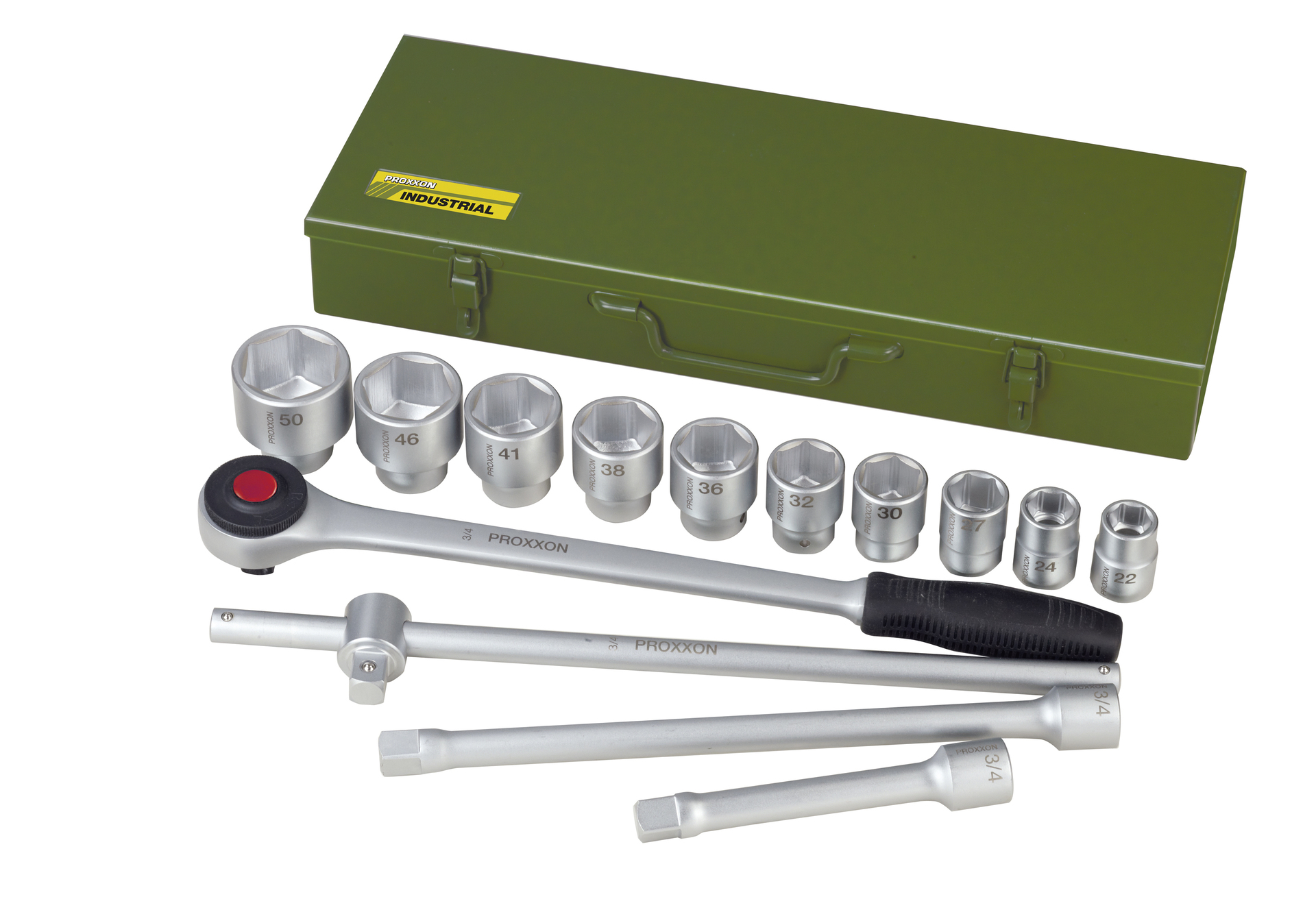 Der Steckschlüsselsatz 3/4″ mit Vierkant-Antrieb von PROXXON ist ideal für den kraftvollen Einsatz an Lastwagen, Traktoren und Maschinen. Mit Einsätzen von 22 – 50 mm. Gefertigt aus robustem CrV-Stahl. 520 mm lange Umschaltratsche, feinverzahnt (72 Zähne) mit Entriegelungs-Mechanismus (Lösen der Einsätze auf Knopfdruck) und Griff aus öl-/säurebeständigem TPR. Hebel mit Gleitstück (500 mm). Je eine Verlängerung 200 und 400 mm. Steckschlüsseleinsätze mit SW 22 – 24 – 27 – 30 – 32 – 36 – 38 – 41 – 46 und 50 mm. Geliefert in stabiler Stahlbox (pulverbeschichtet) mit Tragegriff. Gewerblich voll nutzbar!