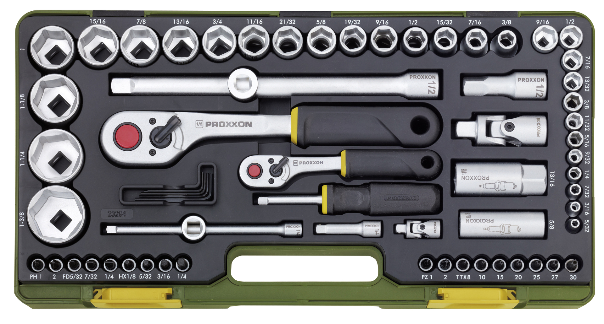 Der PROXXON Steckschlüsselsatz für zöllige Schraubengrößen kommt in einem kompakten Kunststoffkoffer mit Schnappverschluss und stabiler Einlage.