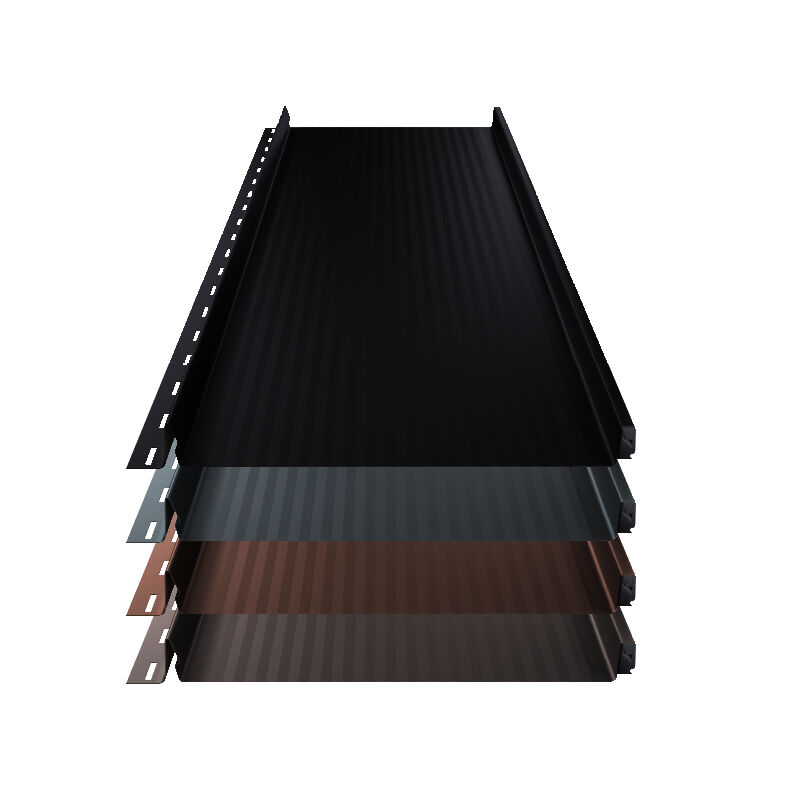 Stehfalz Terrano Stahl 0,50mm Stärke 316mm Breite 35µm Matt Standard Farbbeschichtung mit Miniwelle Das Terrano Paneel wird sowohl in der traditionellen als auch in der zeitgenössischen Architektur verwendet und verleiht Ihrem Dach oder Ihrer Fassade ein ästhetisches und schickes Erscheinungsbild. Die Miniwellen und die fortschrittliche Click-Lock-Technologie tragen zur zusätzlichen Festigkeit des Paneels bei. Die Miniwellenprägung wirft Lichtreflexe zurück, wodurch der durch Spannungen und leichte Bodenunebenheiten verursachte Wellen-Effekt weniger auffällig wird. Die Click-Lock-Technologie ermöglicht nicht nur eine verdeckte Schraubmontage, sondern gewährleistet auch erhöhte Sicherheit und Stabilität. Durch spezifische Knicke in den Falzen greifen die Bleche nahtlos ineinander und verleihen dem Dach bzw. der Fassade eine deutlich höhere Stabilität. Das Stehfalzprofil Terrano hat eine Blechstärke von 0,50mm und ist mit einer 35µm Matt Standard Farbbeschichtung versehen. Diese matte Lackierung verleiht dem Blech nicht nur sein charakteristisches Erscheinungsbild, sondern bietet auch eine verbesserte Kratzfestigkeit im Vergleich zu herkömmlichen Polyesterlackierungen. Eine Auswahl von Farbvarianten steht zur Verfügung, um das Aussehen des Daches oder der Fassade nach individuellen Vorlieben anzupassen. Der Hersteller gewährt eine Garantie von 25 Jahren. Die Gesamtbreite des Terrano Blechs beträgt 316mm, die Deckbreite 281mm. Die Höhe des Stehfalzes beträgt 28mm, und die Click-Höhe liegt bei 30,5mm. Ein cm-genauer Längenzuschnitt nach Ihren speziellen Wünschen ist ohne zusätzliche Kosten möglich. Das Stehfalzprofil ist mit oder ohne Antitropfbeschichtung erhältlich. Bitte beachten Sie, dass eine Antitropfbeschichtung ausschließlich bei Stehfalzblechen für die Dachmontage verwendet wird. Bei Wandblechen für die Fassade wird keine Antitropfbeschichtung benutzt. Optional gegen Aufpreis: Antitropfbeschichtung Hydrocontrol Bei großen Temperaturschwankungen kann sich bei unisolierten Metalldachprofilen Kondenswasser unter dem Dach bilden. Um dieses zu vermeiden gibt es die Antitropfbeschichtung. Dies ist eine selbstklebende Membran / Vlies, welche an der Unterseite des Bleches befestigt wird. Die Vliesstoffbeschichtung verhindert das Abtropfen von Kondenswasser und nimmt dieses auf. Gleichzeitig reduziert die Antitropfbeschichtung die Geräuschentwicklung bei Starkregen und Hagel, da die Schwingungen des Bleches durch das Vlies gedämpft werden. Die Enden der Vliesstoffbeschichtung (ca. 10 – 15cm) müssen selber abgeflammt bzw. mit Vlieslack gesättigt werden. Dadurch wird vermieden, dass Regenwasser durch die Kapillarwirkung in das Vlies ziehen kann und abtropft. Unsere Beschichtung Bleche mit der 35µm Matt Standard Beschichtung sind äußerst angesehen bei Metalldacheindeckungen. Heutzutage werden beidseitig verzinkte Bleche verwendet, was für einen besseren Schutz vor Korrosion sorgt. Die äußerste Farbschicht verleiht dem Produkt eine matte und raue Oberfläche sowie seine endgültige Textur. Des Weiteren schützt die Farbbeschichtung das Blech vor äußeren Einflüssen. Der Hersteller gewährt eine Garantie von 25 Jahren auf die 35µm Matt Standard Beschichtung.
