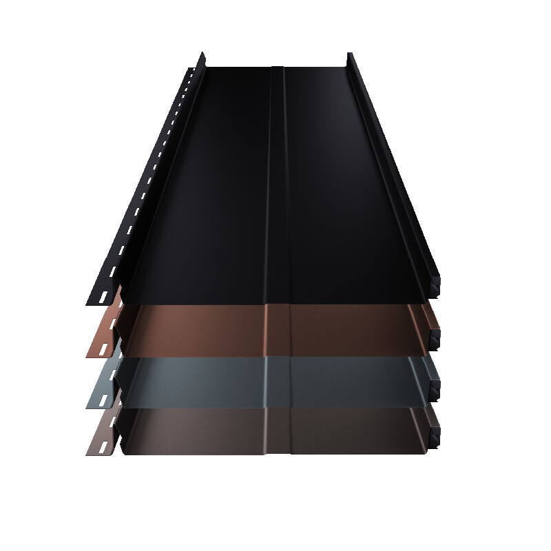 Stehfalz Terrano Stahl 0,50mm Stärke 316mm Breite 35µm Matt Standard Farbbeschichtung mit Prägung Das elegante Stehfalzblech Terrano mit Prägung ist ein beliebtes Dach- und Wandprofil, das sowohl in der klassischen als auch in der Das ansprechende Stehfalzblech Terrano mit Prägung erfreut sich als Dach- und Wandprofil großer Beliebtheit und findet Anwendung sowohl in der klassischen als auch in der modernen Architektur. Durch die Prägung und die innovative Click-Lock-Technologie verleiht das Paneel Ihrem Dach oder Ihrer Fassade nicht nur ein stilvolles Erscheinungsbild, sondern auch zusätzliche Stabilität. Die Click-Lock-Technologie, die eine verdeckte Schraubmontage ermöglicht, gewährleistet nicht nur, dass keine Schrauben auf dem Dach sichtbar sind, sondern auch erhöhte Sicherheit und Stabilität. Die Falzen mit Knickelementen sorgen während der Montage für ein Einrasten der Terrano Stehfalzbleche, was zu einer deutlich höheren Stabilität. Sogenannte Abdeckkappen decken zudem die Stellen ab, an denen zwei Paneele übereinander gelegt werden oder sich überlappen. Das Stehfalzprofil Terrano verfügt über eine Blechstärke von 0,50mm und ist mit einer 35µm Matt Standard Farbbeschichtung ausgestattet, die im Vergleich zu herkömmlichen Polyesterlackierungen eine robuste Kratzfestigkeit bietet. Verschiedene Farbvarianten stehen zur Verfügung, um die Optik des Daches nach individuellen Wünschen anzupassen. Der Hersteller gewährt eine Garantie von 25 Jahren. Die Gesamtbreite des Blechs beträgt 316mm, die Deckbreite liegt bei 281mm, die Höhe des Stehfalzes beträgt 28mm und die Click-Höhe liegt bei 30,5mm. Ein Längenzuschnitt der Bleche erfolgt cm-genau auf Maß nach Ihren persönlichen Anforderungen und das ohne zusätzliche Gebühren. Das Stehfalzprofil ist mit oder ohne Antitropfbeschichtung erhältlich. Bitte beachten Sie, dass eine Antitropfbeschichtung ausschließlich bei Stehfalzblechen für die Dachmontage empfohlen wird. Bei Wandblechen für die Fassade ist keine Antitropfbeschichtung erforderlich. Optional gegen Aufpreis: Antitropfbeschichtung Hydrocontrol Bei großen Temperaturschwankungen kann sich bei unisolierten Metalldachprofilen Kondenswasser unter dem Dach bilden. Um dieses zu vermeiden gibt es die Antitropfbeschichtung. Dies ist eine selbstklebende Membran/ Vlies, welche an der Unterseite des Bleches befestigt wird. Die Vliesstoffbeschichtung verhindert das Abtropfen von Kondenswasser und nimmt dieses auf. Gleichzeitig reduziert die Antitropfbeschichtung die Geräuschentwicklung bei Starkregen und Hagel, da die Schwingungen des Bleches durch das Vlies gedämpft werden. Die Enden der Vliesstoffbeschichtung (ca. 10 – 15cm) müssen selber abgeflammt bzw. mit Vlieslack gesättigt werden. Dadurch wird vermieden, dass Regenwasser durch die Kapillarwirkung in das Vlies ziehen kann und abtropft. Unsere Beschichtung Bleche mit der 35µm Matt Standard Beschichtung sind äußerst angesehen bei Metalldacheindeckungen. Heutzutage werden beidseitig verzinkte Bleche verwendet, was für einen besseren Schutz vor Korrosion sorgt. Die äußerste Farbschicht verleiht dem Produkt eine matte und raue Oberfläche sowie seine endgültige Textur. Des Weiteren schützt die Farbbeschichtung das Blech vor äußeren Einflüssen. Der Hersteller gewährt eine Garantie von 25 Jahren auf die 35µm Matt Standard Beschichtung.