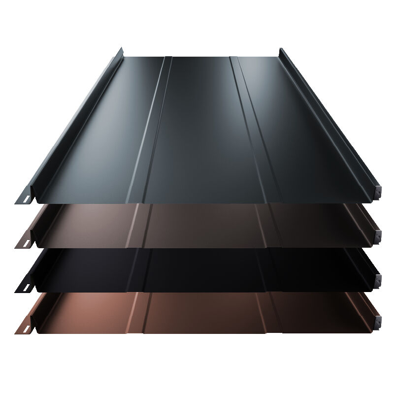 Stehfalz Terrano Stahl 0,50mm Stärke 525mm Breite 35µm Matt Standard Farbbeschichtung mit Prägung Das stilvolle Stehfalzblech Terrano mit Prägung erfreut sich als Dach- und Wandprofil großer Beliebtheit und findet Anwendung sowohl in der klassischen als auch in der modernen Architektur. Das Paneel verleiht Ihrem Dach bzw. Ihrer Fassade ein ansprechendes Erscheinungsbild und gewährleistet zusätzliche Stabilität durch die Prägung und die innovative Click-Lock-Technologie. Durch die verdeckte Schraubmontage mittels der Click-Lock-Technologie sind keine Schrauben auf dem Dach oder an der Fassade sichtbar, was nicht nur ein ästhetisches, sondern auch ein sicherheits- und stabilitätsförderndes Merkmal ist. Während der Montage rasten die Terrano Stehfalzbleche durch Knicke in den Falzen ineinander ein, wodurch dem Dach bzw. der Fassade eine deutlich höhere Stabilität verliehen wird. Zusätzlich sorgen Abdeckkappen dafür, dass Stellen, an denen zwei Paneele übereinander gelegt werden oder sich überlappen, abgedeckt werden. Das Stehfalzprofil Terrano weist eine Blechstärke von 0,50mm auf und ist mit einer 35µm Matt Standard Farbbeschichtung versehen, die im Vergleich zu herkömmlichen Polyesterlackierungen eine robuste Kratzfestigkeit bietet. Es stehen verschiedene Farbvarianten zur Auswahl, um die Optik des Daches nach individuellen Wünschen anzupassen. Der Hersteller gewährt großzügige 25 Jahre Garantie. Die Gesamtbreite des Blechs beträgt 525mm, die Deckbreite liegt bei 495mm, die Höhe des Stehfalzes beträgt 28mm, und die „Click-Höhe“ liegt bei 30,5mm. Der Längenzuschnitt der Stehfalzbleche erfolgt cm-genau auf Maß, exakt gemäß Ihren speziellen Anforderungen und das ohne zusätzliche Kosten. Das Stehfalzprofil ist mit oder ohne Antitropfbeschichtung erhältlich. Bitte beachten Sie, dass eine Antitropfbeschichtung ausschließlich bei Stehfalzblechen für die Dachmontage verwendet wird. Bei Wandblechen für die Fassade wird keine Antitropfbeschichtung benutzt. Optional gegen Aufpreis: Antitropfbeschichtung Hydrocontrol Bei großen Temperaturschwankungen kann sich bei unisolierten Metalldachprofilen Kondenswasser unter dem Dach bilden. Um dieses zu vermeiden gibt es die Antitropfbeschichtung. Dies ist eine selbstklebende Membran / Vlies, welche an der Unterseite des Bleches befestigt wird. Die Vliesstoffbeschichtung verhindert das Abtropfen von Kondenswasser und nimmt dieses auf. Gleichzeitig reduziert die Antitropfbeschichtung die Geräuschentwicklung bei Starkregen und Hagel, da die Schwingungen des Bleches durch das Vlies gedämpft werden. Die Enden der Vliesstoffbeschichtung (ca. 10 – 15cm) müssen selber abgeflammt bzw. mit Vlieslack gesättigt werden. Dadurch wird vermieden, dass Regenwasser durch die Kapillarwirkung in das Vlies ziehen kann und abtropft. Optional gegen Aufpreis: IZO-System Das IZO System besteht aus einer werkseitig angebrachten EPDM Matte, die eine erhöhte Steifigkeit der Platten gewährleistet. Ein bedeutender Vorteil dieses Systems liegt darin, dass die Form des Terrano Stehfalz ohne den Wellen-Effekt, erhalten bleibt. Die IZO Beschichtung bietet zusätzliche Vorteile wie eine schnellere und gleichmäßigere Erwärmung der Dachplatten sowie eine Reduzierung von Geräuschen bei Regen und Wind. Die EPDM Beschichtung absorbiert typische Plattenvibrationen und trägt somit zu einer angenehmen Ruhe im Inneren Ihres Hauses bei. Unsere Beschichtung Bleche mit der 35µm Matt Standard Beschichtung sind äußerst angesehen bei Metalldacheindeckungen. Heutzutage werden beidseitig verzinkte Bleche verwendet, was für einen besseren Schutz vor Korrosion sorgt. Die äußerste Farbschicht verleiht dem Produkt eine matte und raue Oberfläche sowie seine endgültige Textur. Des Weiteren schützt die Farbbeschichtung das Blech vor äußeren Einflüssen. Der Hersteller gewährt eine Garantie von 25 Jahren auf die 35µm Matt Standard Beschichtung.