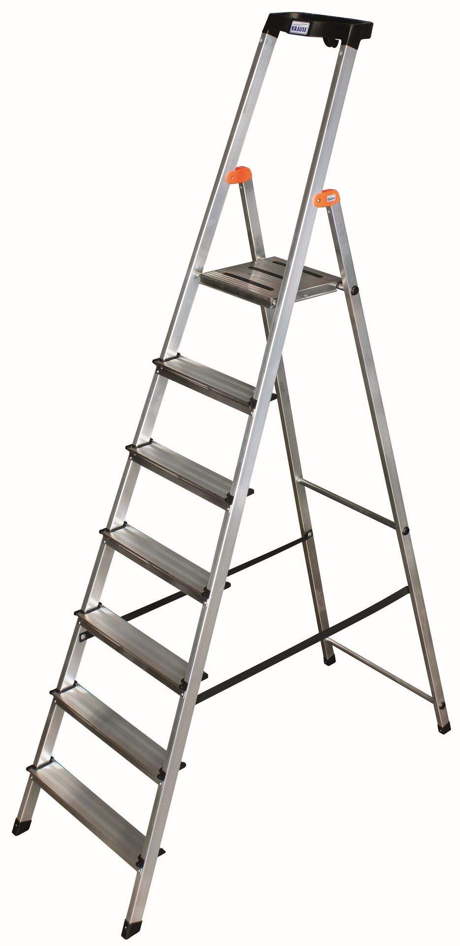 Die komfortable und leichte Aluminium-Sicherheits-Stehleiter mit vielen praktischen Ablagemöglichkeiten.