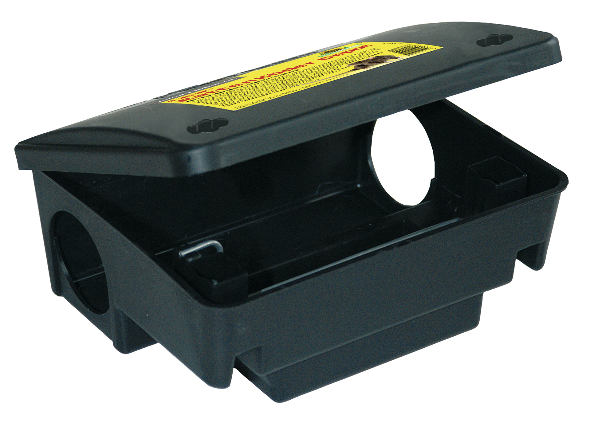 Die wiederverwendbare Köderbox aus Kunststoff ist mit einem kindersicheren Verschluss versehen. Eine Metallstange im Inneren der Box hält die Köder sicher am Platz. Ein Verschleppen des Giftköders außerhalb des Depots wird so vermieden.