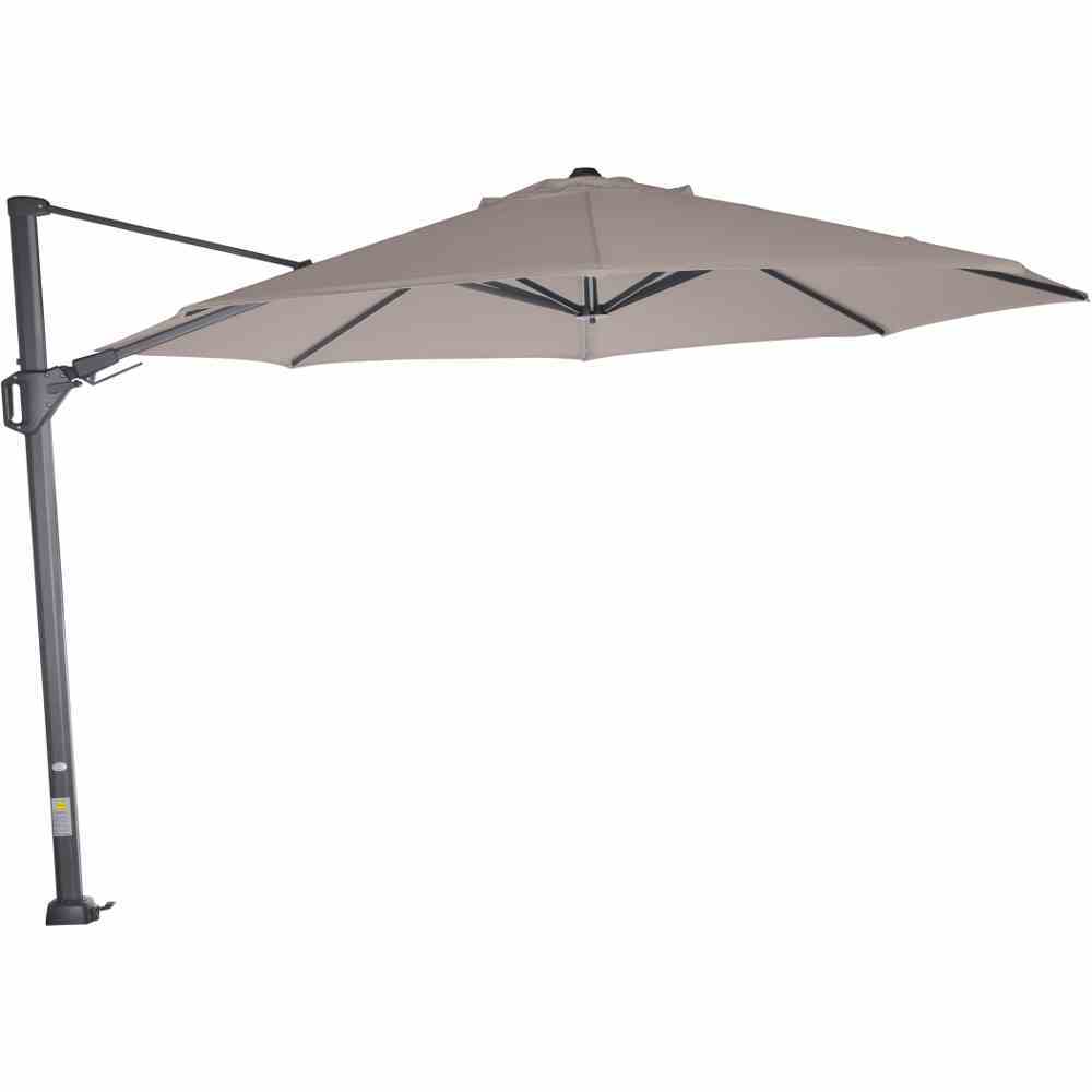– höhenverstellbar: Nein, – Durchmesser Mast: 86x53mm, – Farbe Mast: anthrazit, – Knickbar: Ja, – Durchgangshöhe: 1970mm, – Farbe Bespannung: taupe, – Material Mast: Aluminium, pulverbeschichtet, – Öffnungsmechanik: Kurbel, – Stoffgewicht g/m²: 300g/m², – Schirmform: rund, – Lichtechtheit: >6, – Material Bespannung: Polyester PU-beschichtet, – Maße: Ø 350x251cm, – UV-Schutzfaktor: UPF 50+