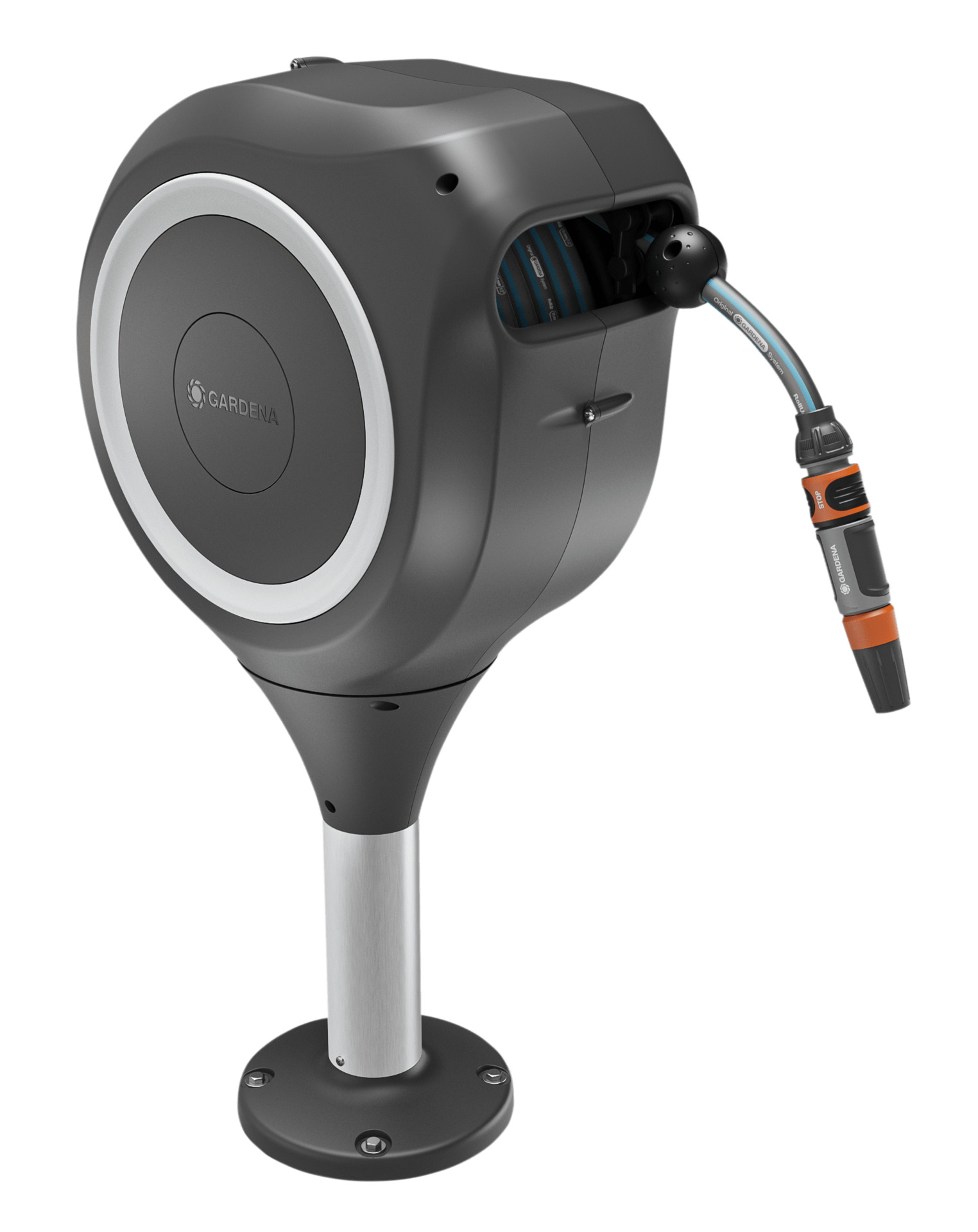 1 x GARDENA Terrassen-Schlauchbox RollUp S, 1 x 15 m GARDENA Qualitätsschlauch 11 mm, 1 x flexibler Anschlussschlauch, Original GARDENA Systemteile (Hahnverbinder, Schlauchverbinder, Wasserstop), 1 x Reinigungsspritze, 1 x Universalbefestigung inkl. Schrauben und Dübel