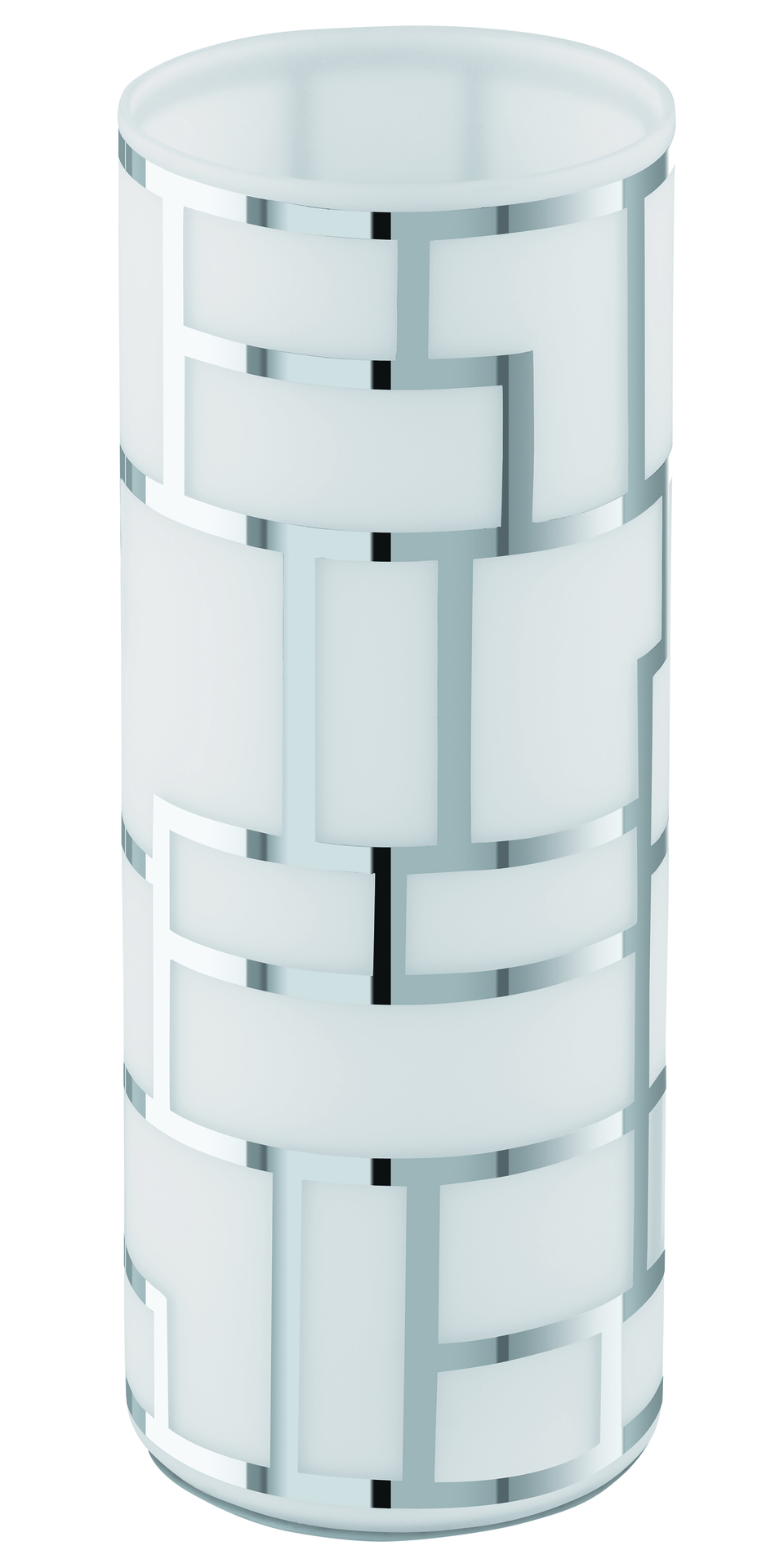 Die Tischleuchte BAYMAN ist aus einem weißen Glas-Zylinder mit einem geometrischen Dekor in Chromfarben gefertigt. Die zeitlose Tischlampe fügt sich nahtlos in moderne Einrichtungen ein. Ein bequemes Ein- und Ausschalten ist über einen Schalter am Kabel möglich. Sie bietet eine stilvolle Beleuchtung für jeden Raum – egal ob im Schlafzimmer auf dem Nachttisch, im Wohnzimmer, Esszimmer oder im Flur. Das Leuchtmittel ist nicht im Lieferumfang enthalten. Geeignet ist die Leuchte für jedes Leuchtmittel mit E27-Sockel.
