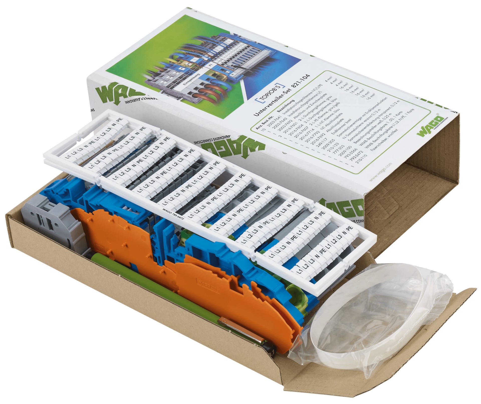 Für die Unterverteilung mit einem FI-Schutzschalter; beinhaltet alle erforderlichen Komponenten zur Verdrahtung einer Einspeisung und den Anschluss von 9 Wechselstrom- und 1 Drehstromkreis.