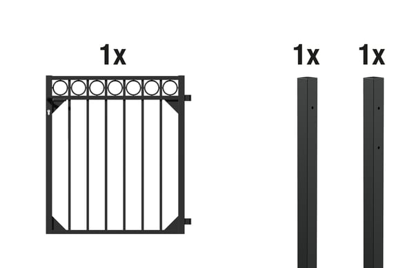 1 Anschlagpfosten Chaussee, Circle, Aluminium, schwarz, zum Einbetonieren60x60/1500, 1 Klobenpfosten Chaussee, Circle, Aluminium, schwarz, zum Einbetonieren60x60/1500, 1 EinzeltorCircle, ohne Pfosten, Aluminium, matt schwarz, 965×1000