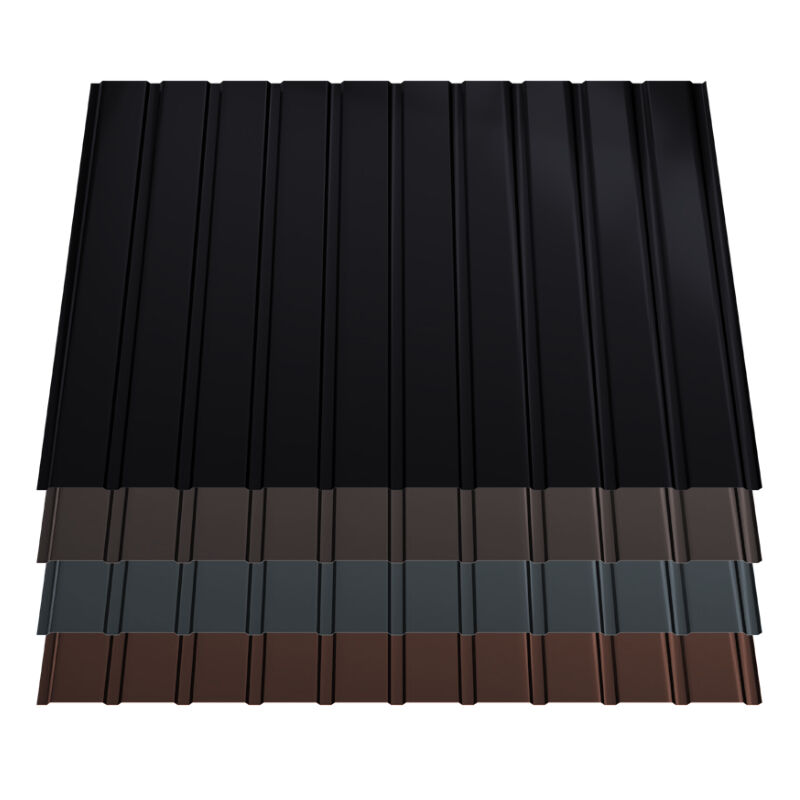 Trapezblech T7 Stahl Wandprofil 0,50mm Stärke 35µm Matt Standard Farbbeschichtung Das Trapezblech T7 Wandprofil ist die ideale Wahl für Projekte, die eine flache und dezente Optik erfordern, denn es beeindruckt mit seiner niedrigen Profilhöhe von nur 6,7mm. Diese elegante Wandverkleidung besteht aus einer 0,50mm dicken Stahlplatte und ist mit einer 35µm Matt Standard Farbbeschichtung versehen. Dank ihrer gröberen Oberflächenstruktur, ist die matte Lackierung besonders kratzresistent und widerstandsfähig im Vergleich zu herkömmlichen Polyesterbeschichtungen. Der Hersteller gewährt eine Garantie von 25 Jahren. Das Trapezblech T7 ist in zwei Varianten verfügbar: einerseits als ungelochte Version und andererseits als PRO/gelochte Variante (weitere Details finden sich unten). Zusätzlich bieten wir eine Auswahl an Farboptionen an und die Bleche werden cm-genau auf die gewünschte Länge auf Maß zugeschnitten und das ohne zusätzliche Kosten. Das T7 Wandblech hat eine Obergurtbreite von 87mm und eine Tiefsickenbreite von 19mm. Die Gesamtbreite des Blechs beträgt 1200mm, während die Nutzbreite 1177mm beträgt. Dies macht es zu einer äußerst praktischen Wahl für vielfältige Anwendungen. Hier ein Beispielbild des T7 PRO/gelocht Wandprofils. Das Besondere an diesem Blech ist die Perforation, die für eine bessere Unterlüftung/Hinterlüftung des Blechs sorgt. Das Profil T7 PRO kann in Kombination mit dem Profil T7 verbaut werden. Das Profil T7 PRO kann in diesem Fall z.B. abwechselnd oben und unten als Streifen verbaut werden. Hier ein Beispielbild des T7 Wandprofils ungelocht. Dieses Profil braucht eine Lattung/Hinterbauung für die Montage, da ansonsten keine Hinterlüftung stattfinden kann. Sollte eine Lattung zur Montage nicht möglich sein, können Sie das ungelochte Profil auch zusammen mit dem T7 PRO/gelocht Profil verbauen. Unsere Beschichtung Bleche mit der 35µm Matt Standard Beschichtung sind äußerst angesehen bei Metalldacheindeckungen. Heutzutage werden beidseitig verzinkte Bleche verwendet, was für einen besseren Schutz vor Korrosion sorgt. Die äußerste Farbschicht verleiht dem Produkt eine matte und raue Oberfläche sowie seine endgültige Textur. Des Weiteren schützt die Farbbeschichtung das Blech vor äußeren Einflüssen. Der Hersteller gewährt eine Garantie von 25 Jahren auf die 35µm Matt Standard Beschichtung.