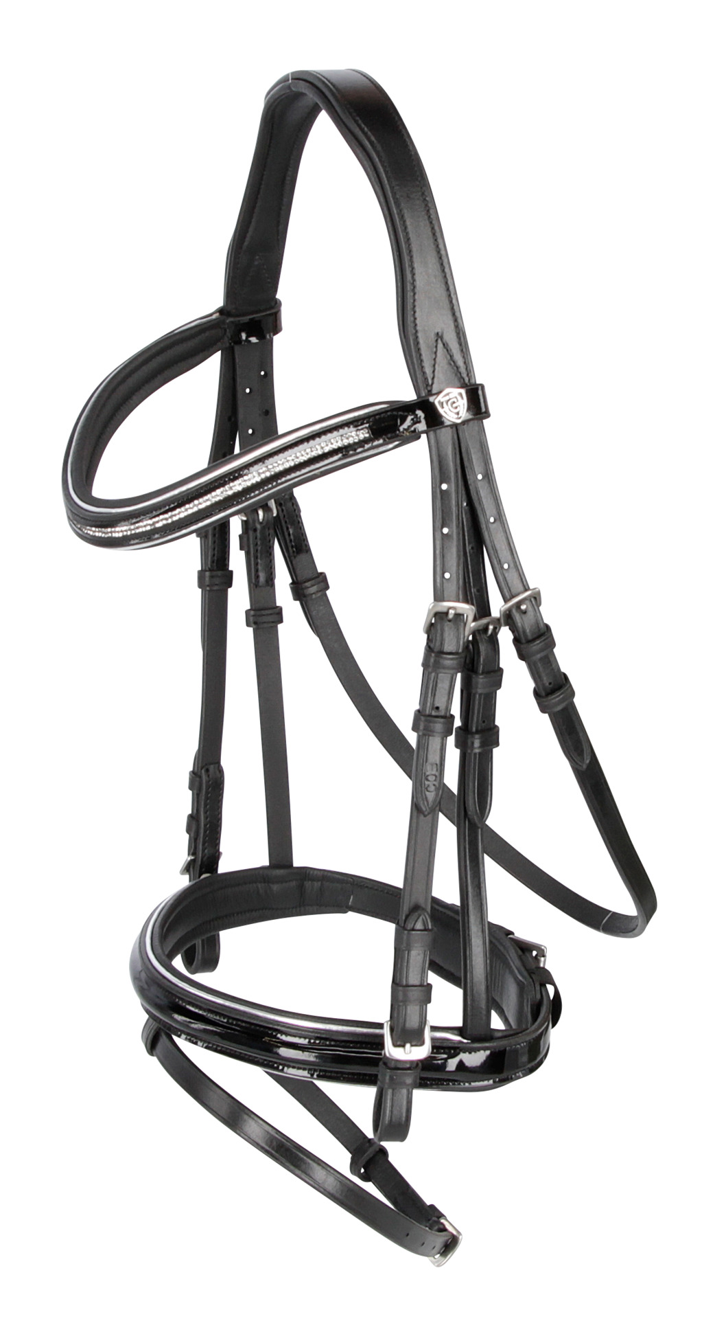 englisch kombiniertes Reithalfter, anatomisch geformtes Stirnband mit zweireihigem Glitzersteinchen-Motiv sowie attraktiver Paspelierung, weiche Polsterung auf Stirn-, Nasen- und Genickriemen, sowie Kinnpad sorgt für hohen Tragekomfort, Stirn- und Nasenriemen in edler Lack-Optik, inkl. Gurtzügel, mit rostfreien Beschlägen