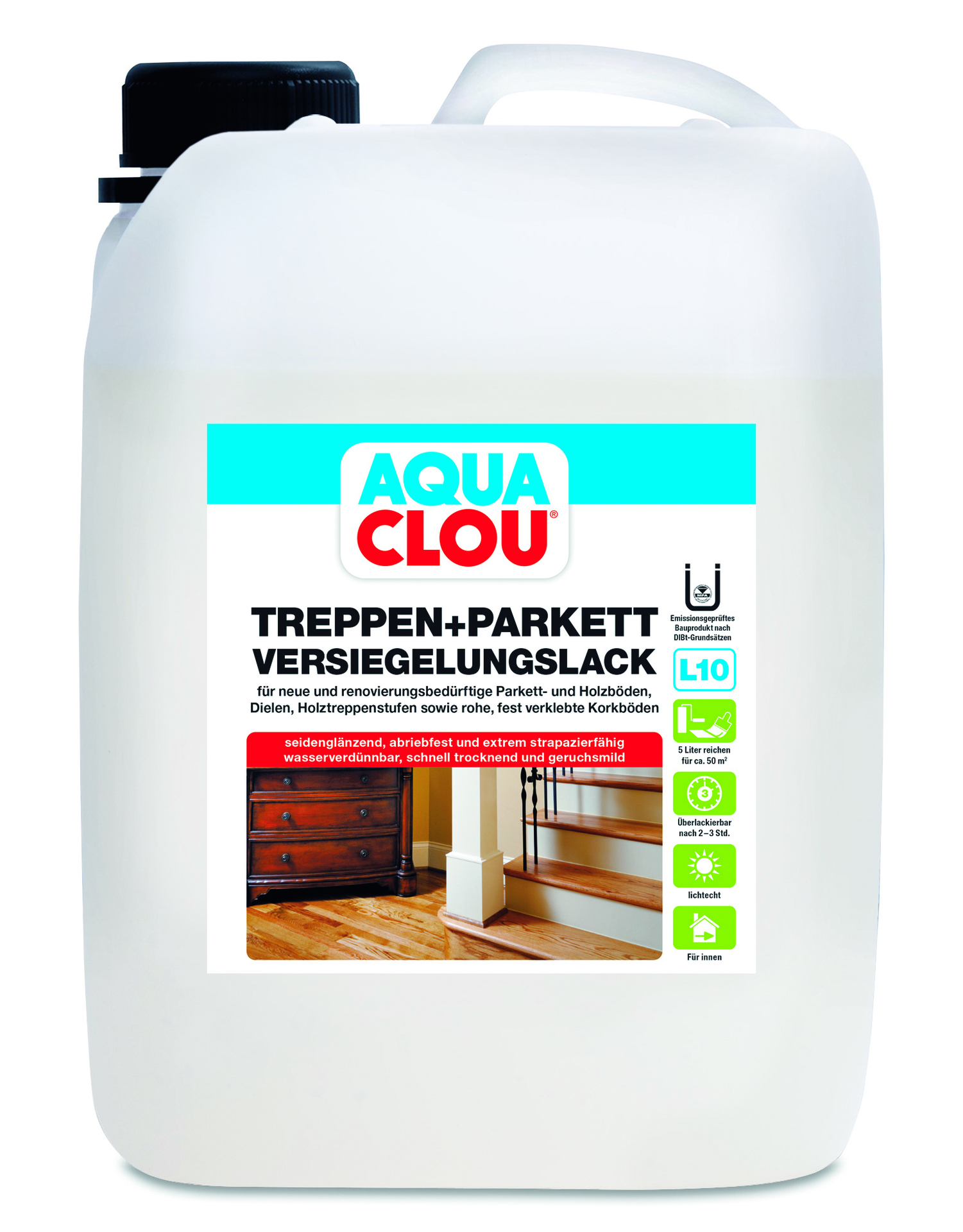 Umweltschonender, wasserverdünnbarer, geruchsmilder, abriebfester Grund- und Versiegelungslack. Handschweißecht und cremebeständig. Beständig gegen PVC Dichtungen (PVC-fest). VOC- Decopaintkonform. Extrem strapazierfähig und schnelltrocknend. Entspricht der DIN 68861-Teil 2 (Verhalten bei Abriebbeanspruchung) und der DIN 53160 (speichel- und schweißecht). Emissionsgeprüftes Bauprodukt nach DIBt-Grundsätzen (Z-157.10-66).Für die Versiegelung von neuen und renovierungsbedürftigen Parkett- und Holzböden, Dielen, Holztreppenstufen, Handläufen sowie unbehandelten Korkböden im Innenbereich.