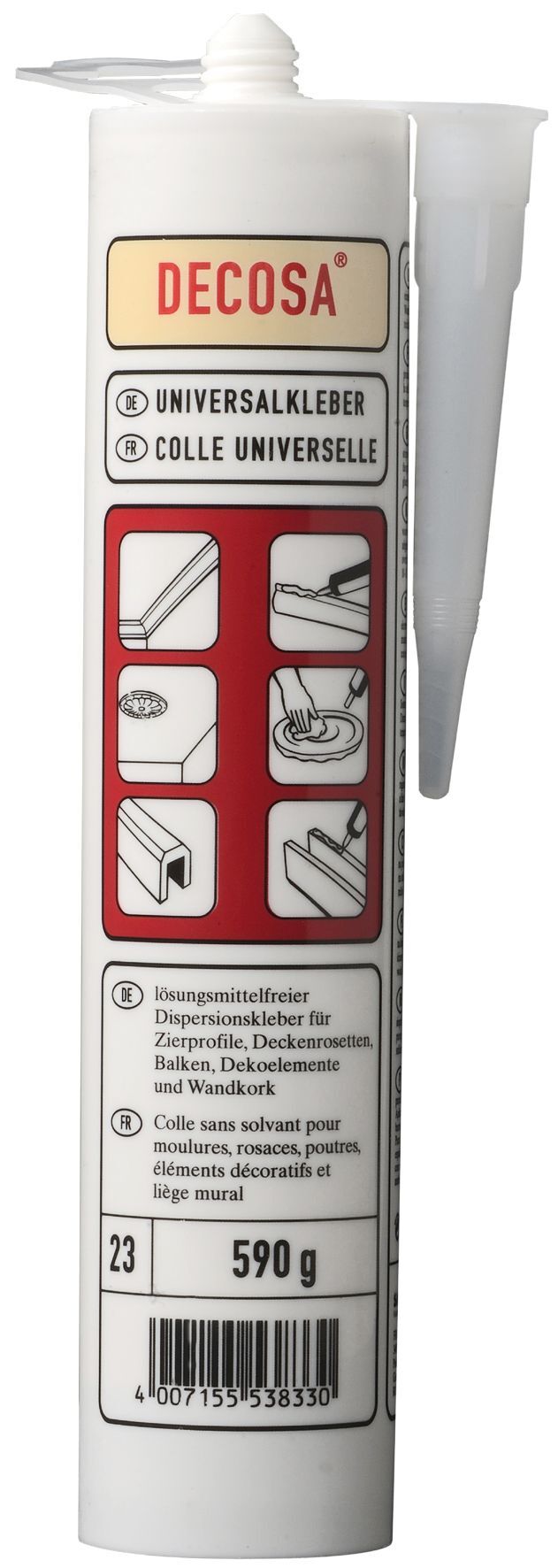 Mit dem lösemittelfreien DECOSA® Universalkleber lassen sich kinderleicht Zierprofile und Rosetten verarbeiten und sicher an Wand und Decke anbringen.