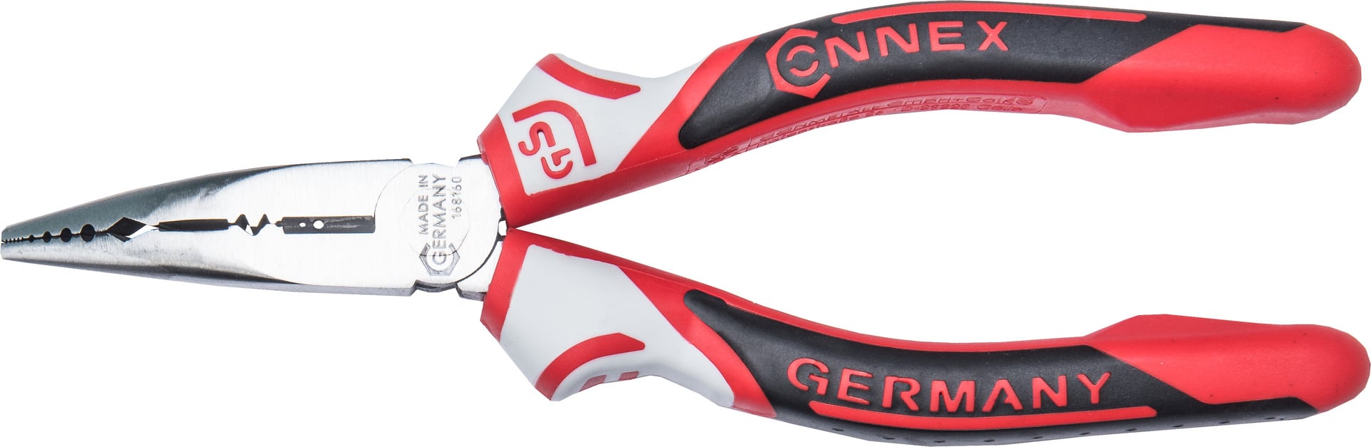 Gemäß der Norm DIN ISO 5745 wurde diese praktische Universalzange von CONNEX hergestellt, die sich für verschiedene Einsatzbereiche eignet. Sie kann nicht nur zum Festziehen und Loslösen von Bauteilen verwendet werden, sondern eignet sich ebenfalls zum Abisolieren von Leitungen oder Verklemmen von Endhülsen. Dank der um 35° gebogenen Spitze lassen sich auch schwierig gelegene Stellen mühelos erreichen.