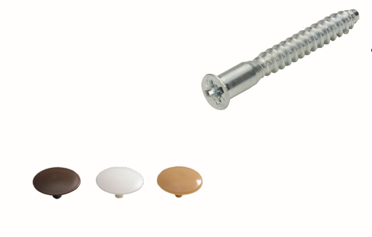 Verbindungsschraube für Korpusverbindungen, 50 mm Länge. Für 5 mm – Bohrungen. Inkl. Kunststoff-Abdeckkappen in dunkelbraun, hellbraun und weiß.