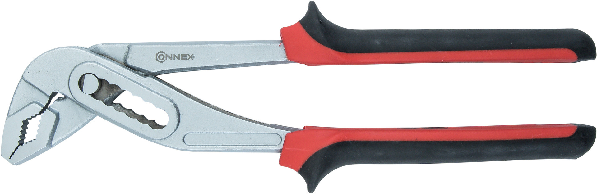 Mit dieser Wasserpumpenzange von CONNEX lassen sich Werkarbeiten im Haushalt komfortabel durchführen. Die Zange selbst wurde aus robustem Metall gefertigt, während der angenehm in der Hand liegende Zwei-Komponentengriff aus Kunststoff besteht. Das siebenfach verstellbare Gelenk kann optimal auf Werkstücke verschiedener Größen angepasst werden. Je nach Wunsch können Sie die Wasserpumpenzange in unserem Sortiment auch in einer anderen Größe erwerben.
