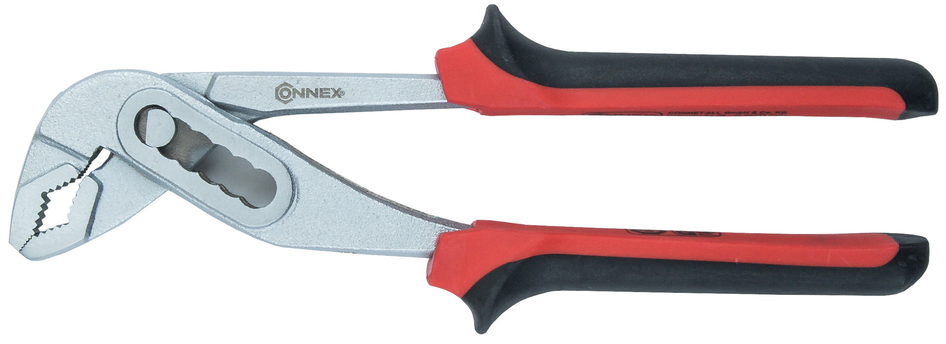 Mit dieser Wasserpumpenzange von CONNEX lassen sich Werkarbeiten im Haushalt komfortabel durchführen. Die Zange selbst wurde aus robustem Metall gefertigt, während der angenehm in der Hand liegende Zwei-Komponentengriff aus Kunststoff besteht. Das siebenfach verstellbare Gelenk kann optimal auf Werkstücke verschiedener Größen angepasst werden. Je nach Wunsch können Sie die Wasserpumpenzange in unserem Sortiment auch in einer anderen Größe erwerben.