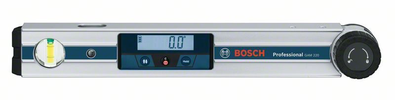 Winkelmesser GAM 220. Exakte und einfache Winkelmessung. Schnelle und präzise Ermittlung von Winkeln. Exakte Übertragung der Winkel auf Werkstücke durch mechanische Feststellschraube möglich. Optimale Ablesbarkeit durch die drehbare, beleuchtete Anzeige. Hold-Funktion zum Festhalten und Übertragen des Messergebnisses per Tastendruck. Robuste und kompakte Bauweise mit IP 54 Schutz. Keine Kalibrierung erfürderlich. 4 x 1,5 V-LR6-Batterie (AA).