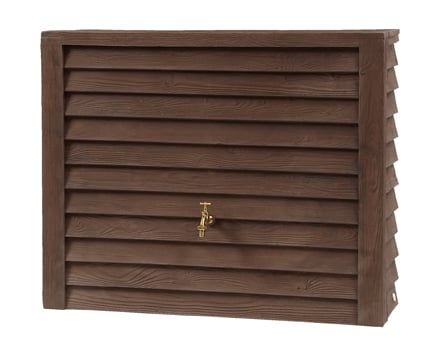 Deko-Regenspeicher im rustikalen Holzdesign zur Aufstellung an der Hauswand. Ein wesentlicher Vorteil dieses stilvollen Behälters besteht darin, dass Sie selbst entscheiden können, auf welcher Seite Sie den Zulaufhahn positionieren möchten. Dazu bohren Sie einfach ein Loch in das Gehäuse.