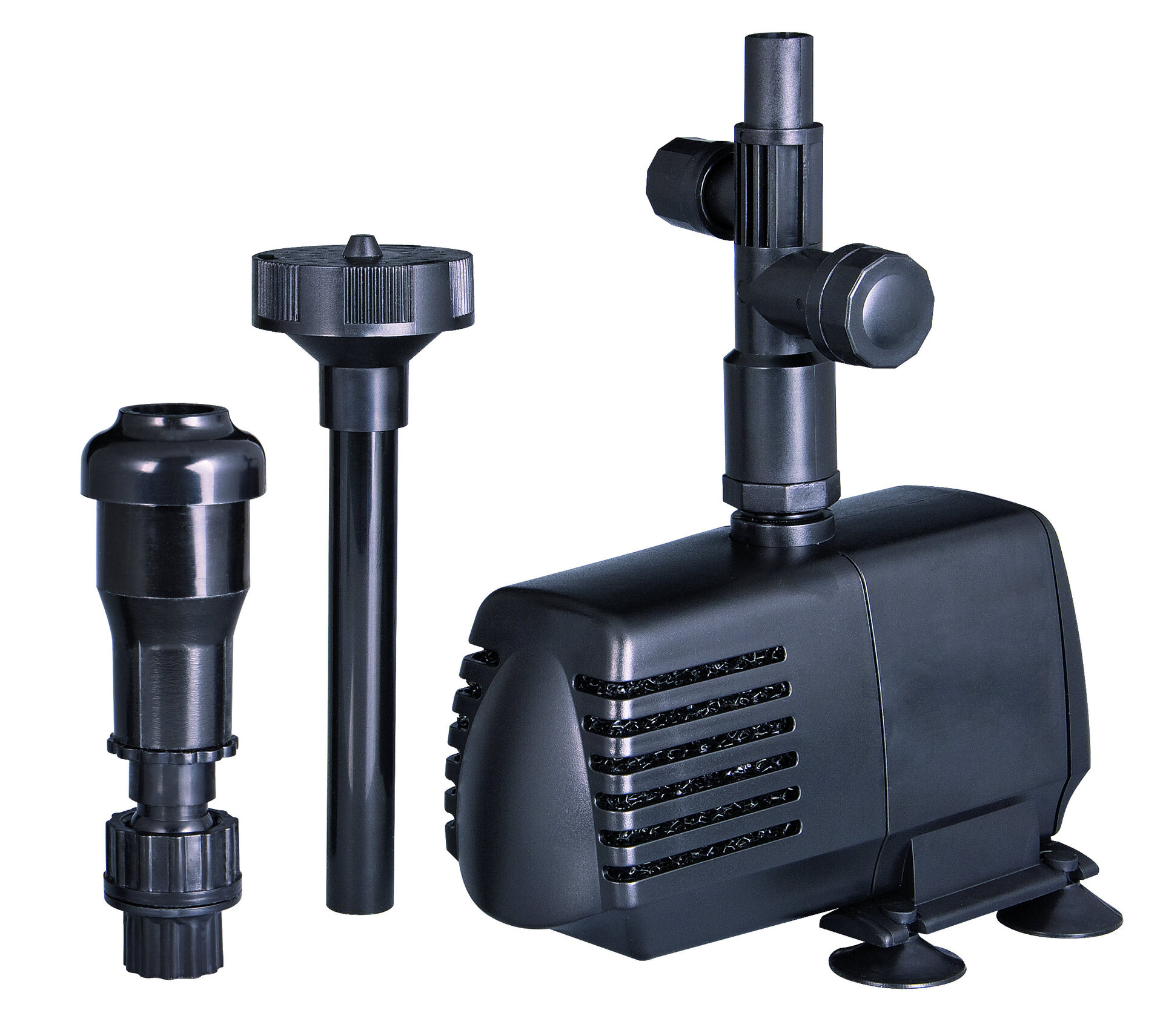 Teichpumpen für Wasserfontänen und Wasserspiele, es gibt sie in verschiedenen Leistungsstufen, sie werden je nach Typ mit einem oder zwei Düsenaufsätzen geliefert.