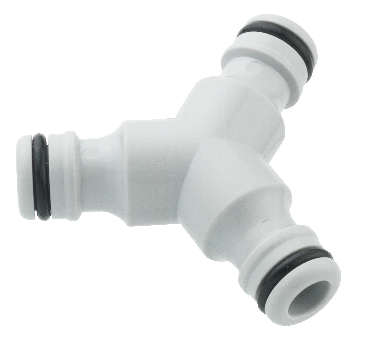 Kunststoff, zur Schlauchabzweigung in zwei Richtungen, die Verbindung wird durch einfaches Ziehen gelöst, mit allen gängigen Stecksystemen kompatibel