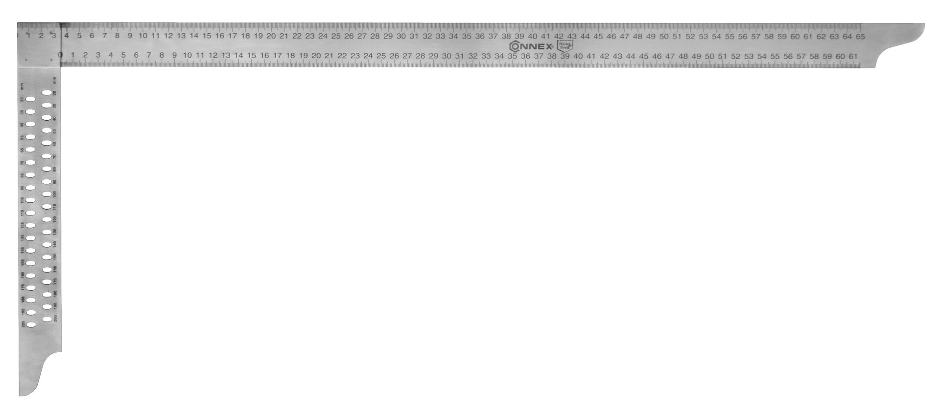 Der Zimmermannswinkel von CONNEX ist aus rostfreiem Stahl gefertigt. Der kurze Schenkel ist wahlweise mit oder ohne Anreißlöcher im Abstand von 5 mm ausgestattet. Der lange Schenkel hat eine gut lesbare Innen- und Außenskala.
