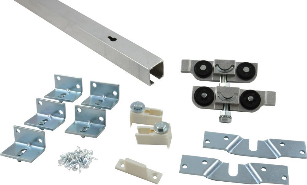 Inhalt: 1 Laufschiene Aluminium, 2 Doppel-Rollapparate, 2 Anschraubplatten, 2 Endfeststeller, 1 Bodenführung, 4 Wandbefestigungswinkel.