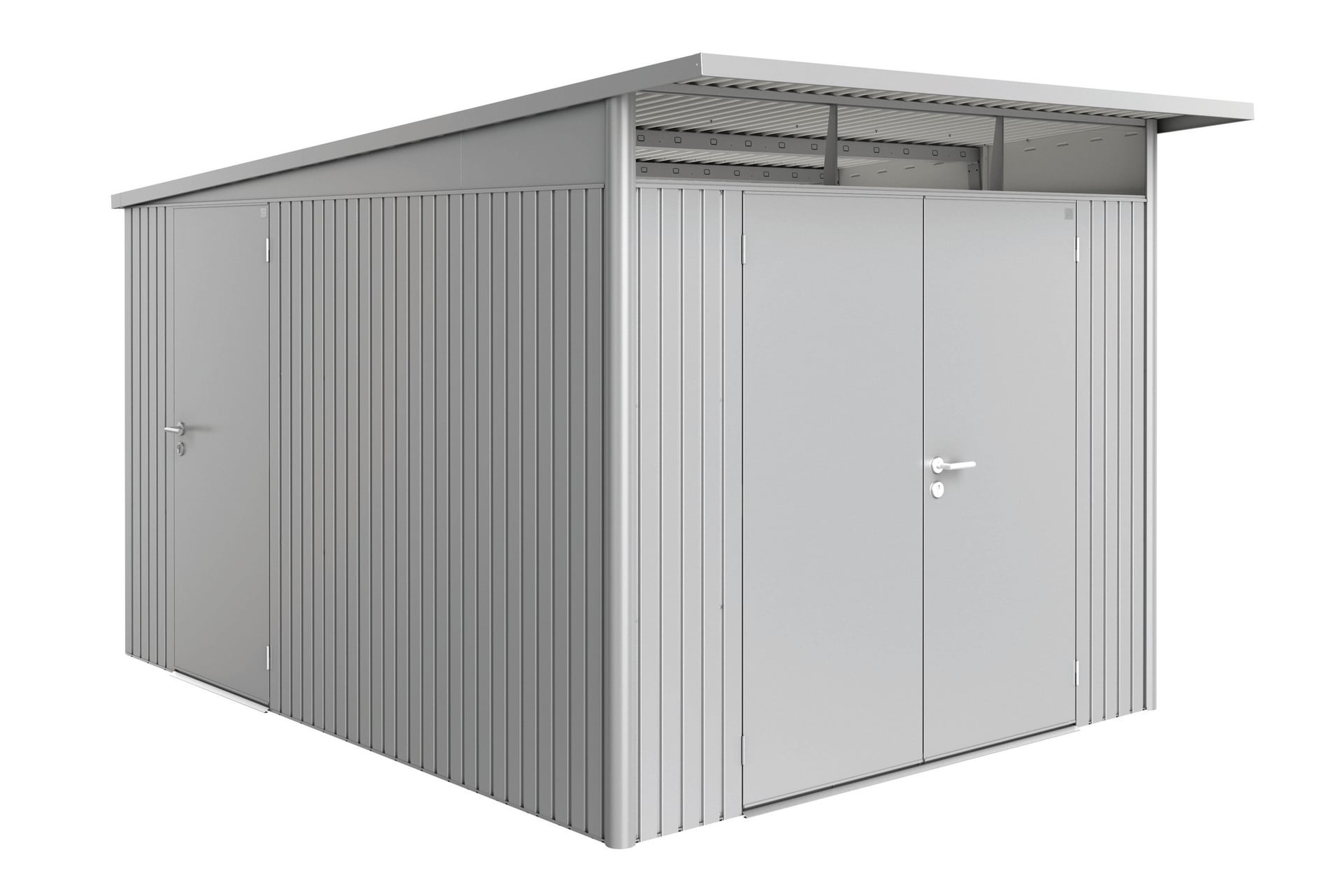 Damit Ihr Gerätehaus von zwei Seiten begehbar wird, können Sie eine Zusatztüre in einer Seitenwand einbauen. Im Lieferumfang der Zusatztür sind eine 3-fach Verriegelung, Edelstahl-Drückergarnitur, Gasdruckfeder, zwei Werkzeughalter sowie die passenden seitlichen Türanschlagbleche enthalten. Der Türanschlag ist nur rechts möglich.