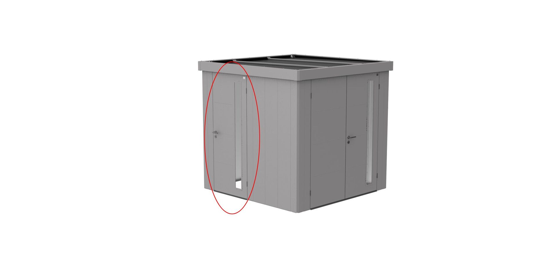 Damit Ihr Gerätehaus von zwei Seiten begehbar wird, können Sie eine Zusatztüre in einer Seiten- oder der Rückwand einbauen. Im Lieferumfang der Zusatztür sind eine 3-fach Verriegelung, Edelstahl-Drückergarnitur, Gasdruckfeder sowie zwei Werkzeughalter enthalten. Der Türanschlag ist nur rechts möglich.